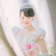 丸顔なのでウェディングドレスのティアラは高さと丸みがあるものに使用しました。