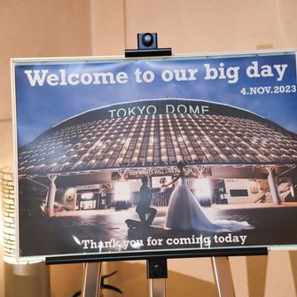 テーマは野球×ディズニーです!!夫婦共々、ジャイアンツファンで東京ドームで前撮りが出来る事を知り、東京ドームホテルにしました!ウェルカムスペースや披露宴会場内に野球グッズを飾り、お色直し前のBGMは選手の登場曲にしました。装花には野球ボールに見立てた花を用意してもらっています。お色直し後のBGMはディズニーの曲にして、ブーケの代わりにミッキーのぬいぐるみを持って登場しました。