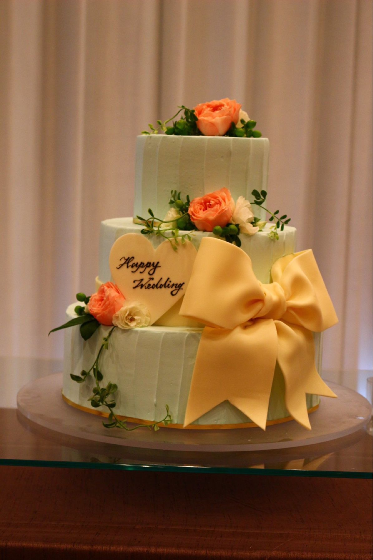 3段のケーキで、大きなリボンが可愛いケーキにしました。カラーも変えられましたが、敢えてここはピンク系統にはせず、水色を採用しました。