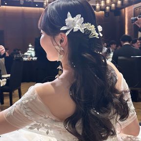 ドレスのウエストマークにも同じくベロアリボンを使用していたため、全体の雰囲気を合わせたくて選びました。リボンは自分で購入しヘアメイクさんにリボンの端がふわっと重なるよう2重に結んでいただきました。深みのある質感がドレスとマッチして、雰囲気がぐっと引き締まりとっても素敵に仕上がりました。