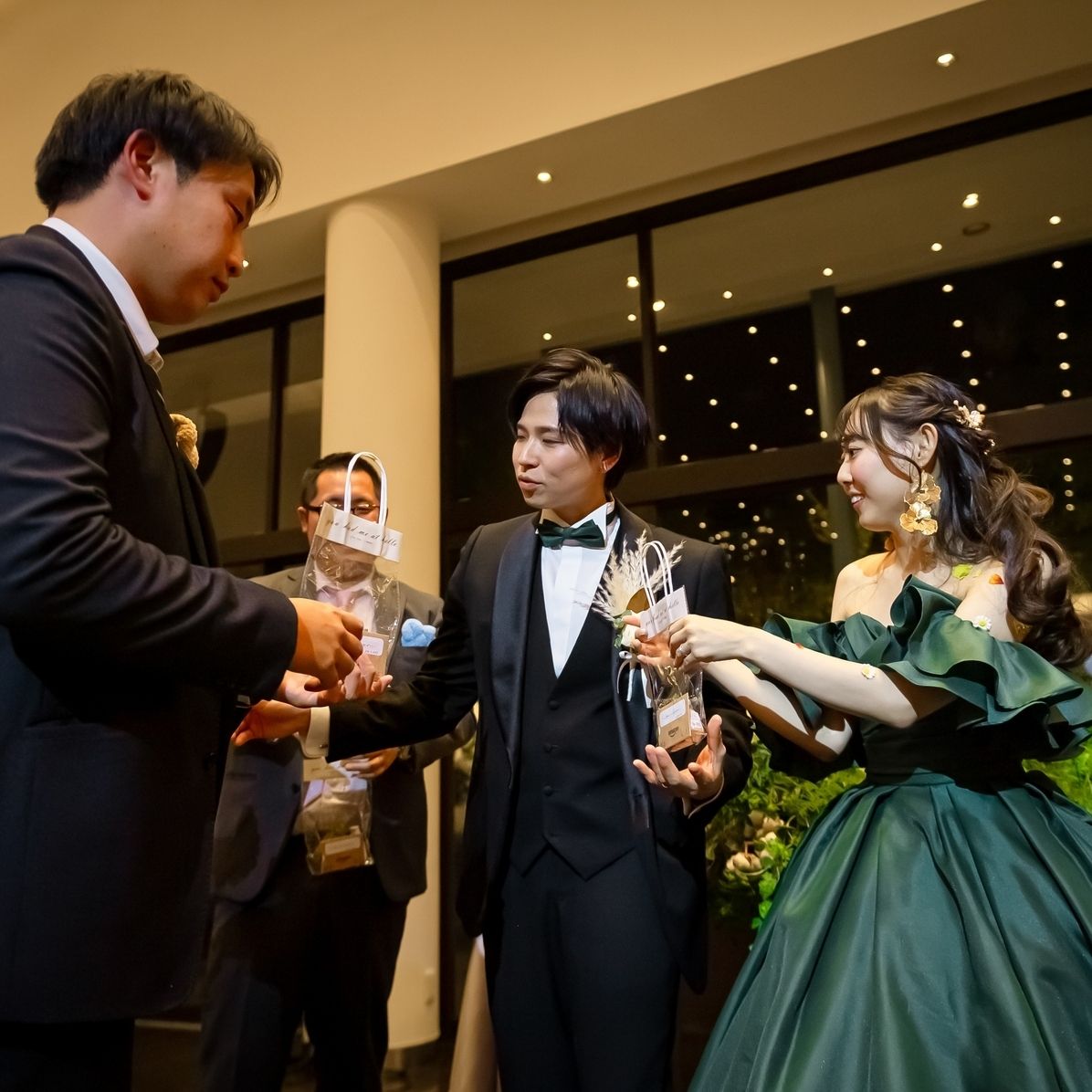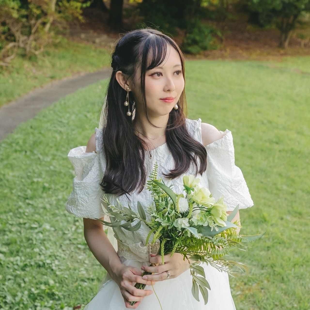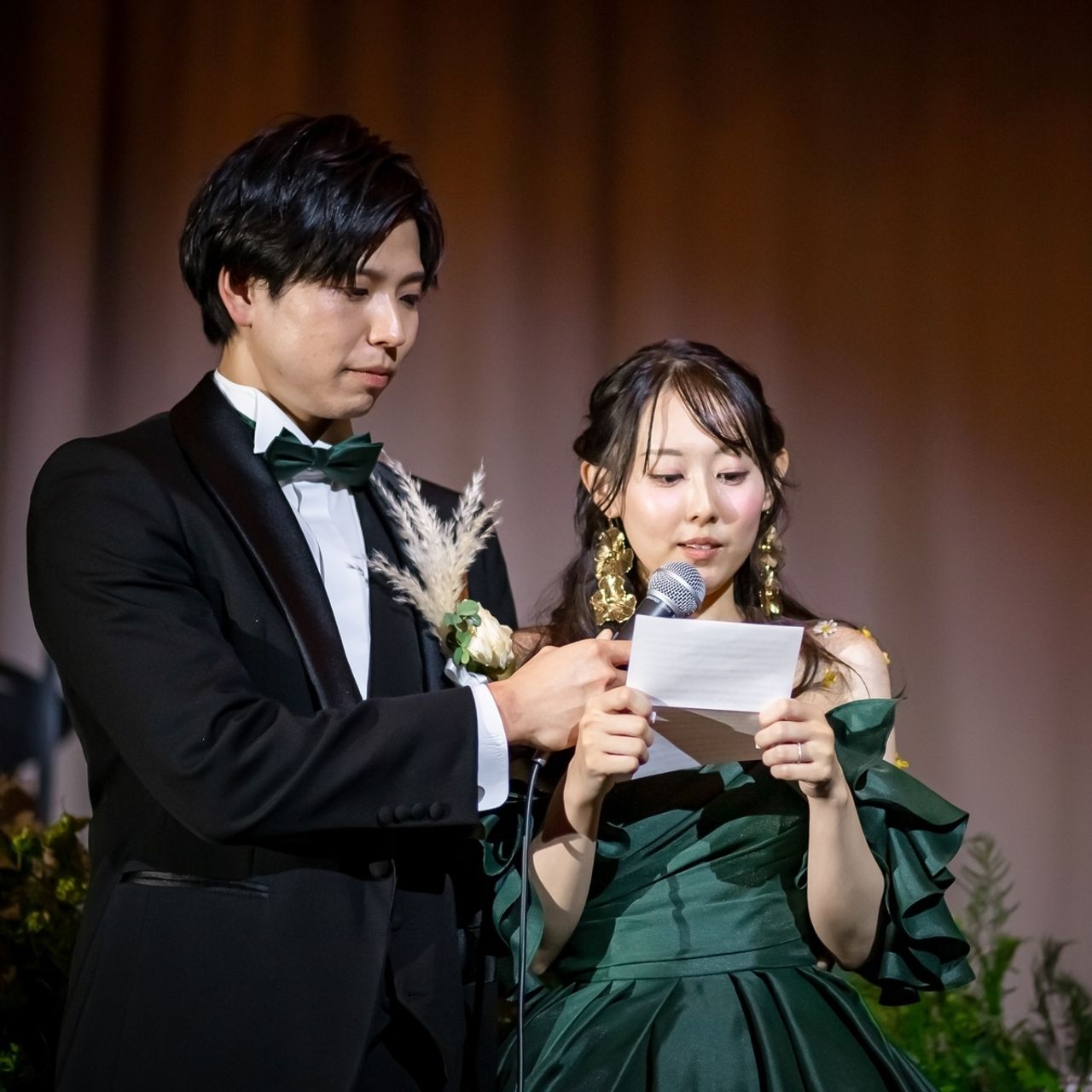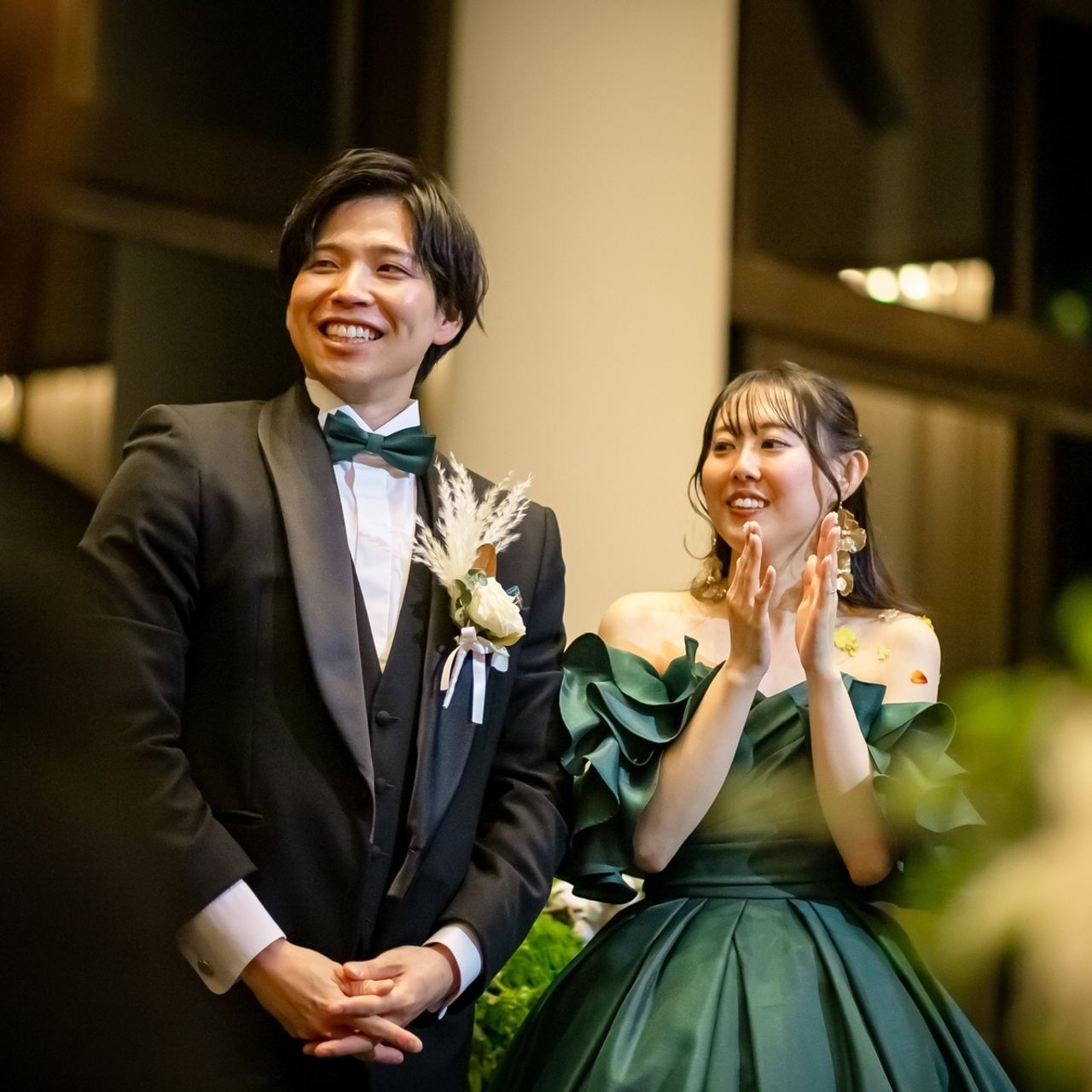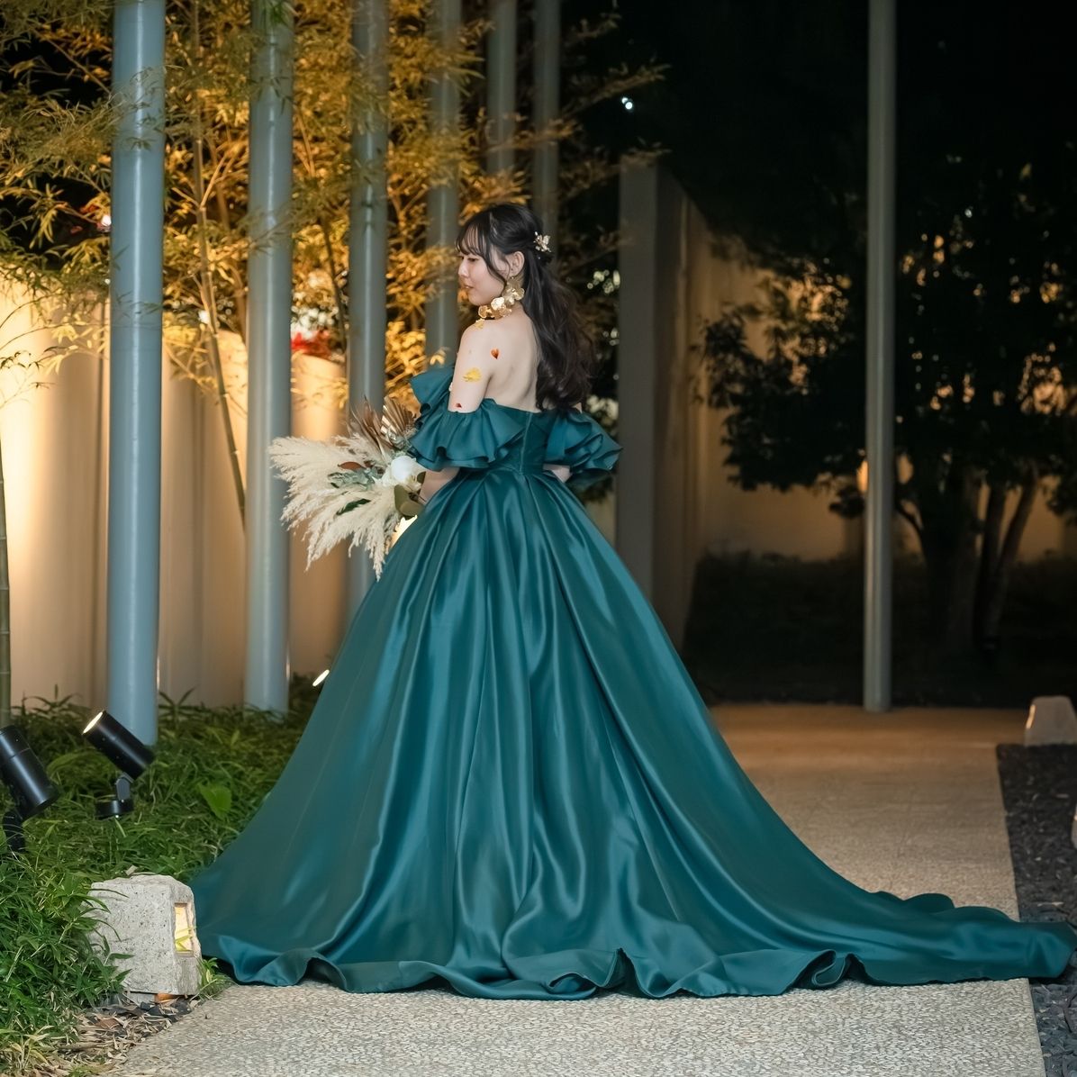 また、フリルショルダーは取り外し可能な2Way仕様なので、入場と途中で雰囲気を変えられる点もお気に入りポイントです。深みのあるグリーンが会場の雰囲気とも相性がよく、リュクスで落ち着いたコーディネートが叶う、思い出深い1着になりました。