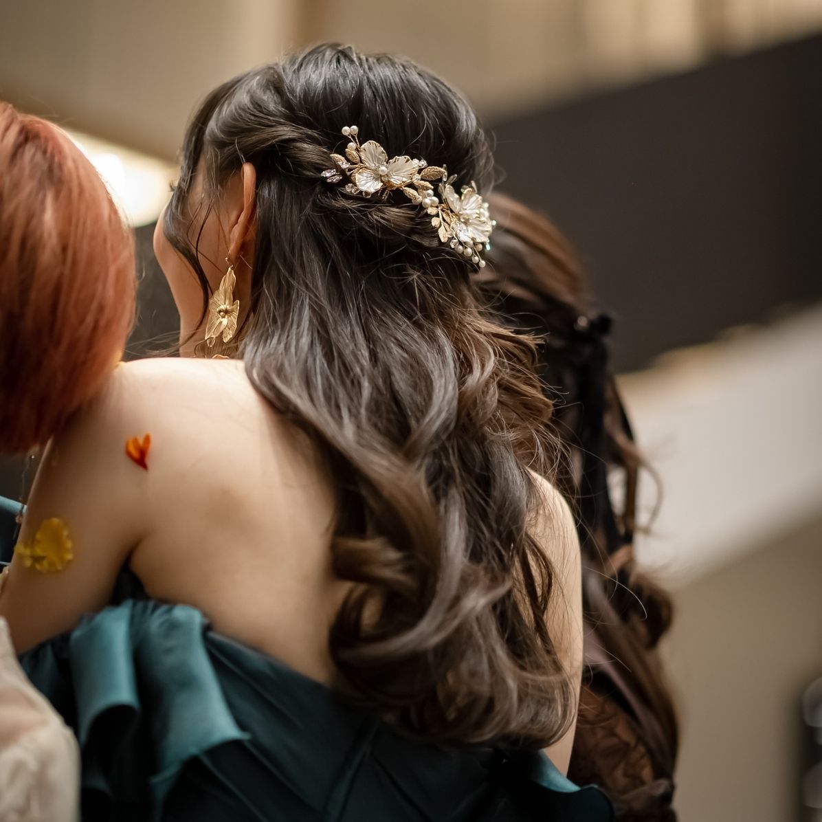 グリーンのドレスとも相性が良く、後ろ姿まで印象に残るスタイリングになりました。
