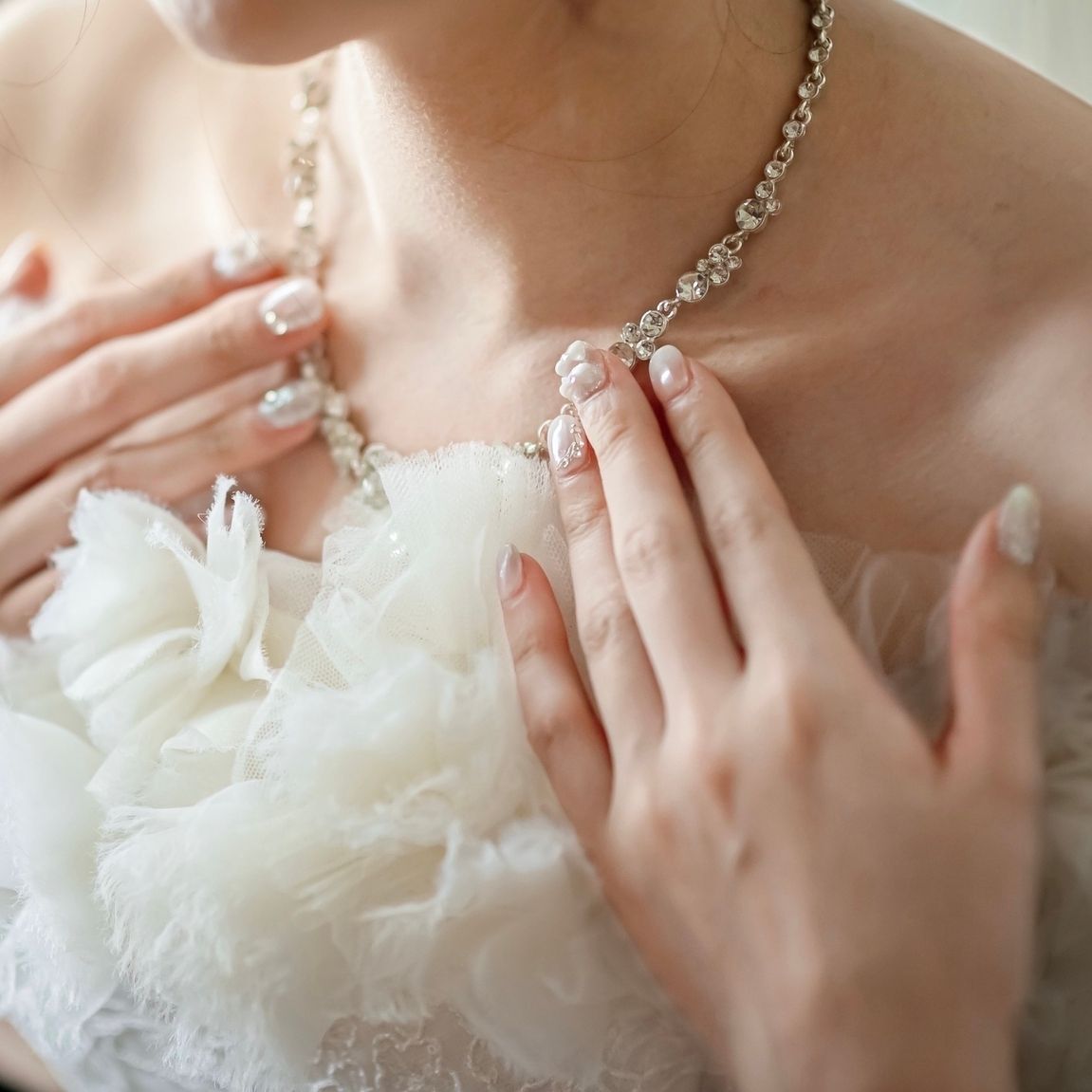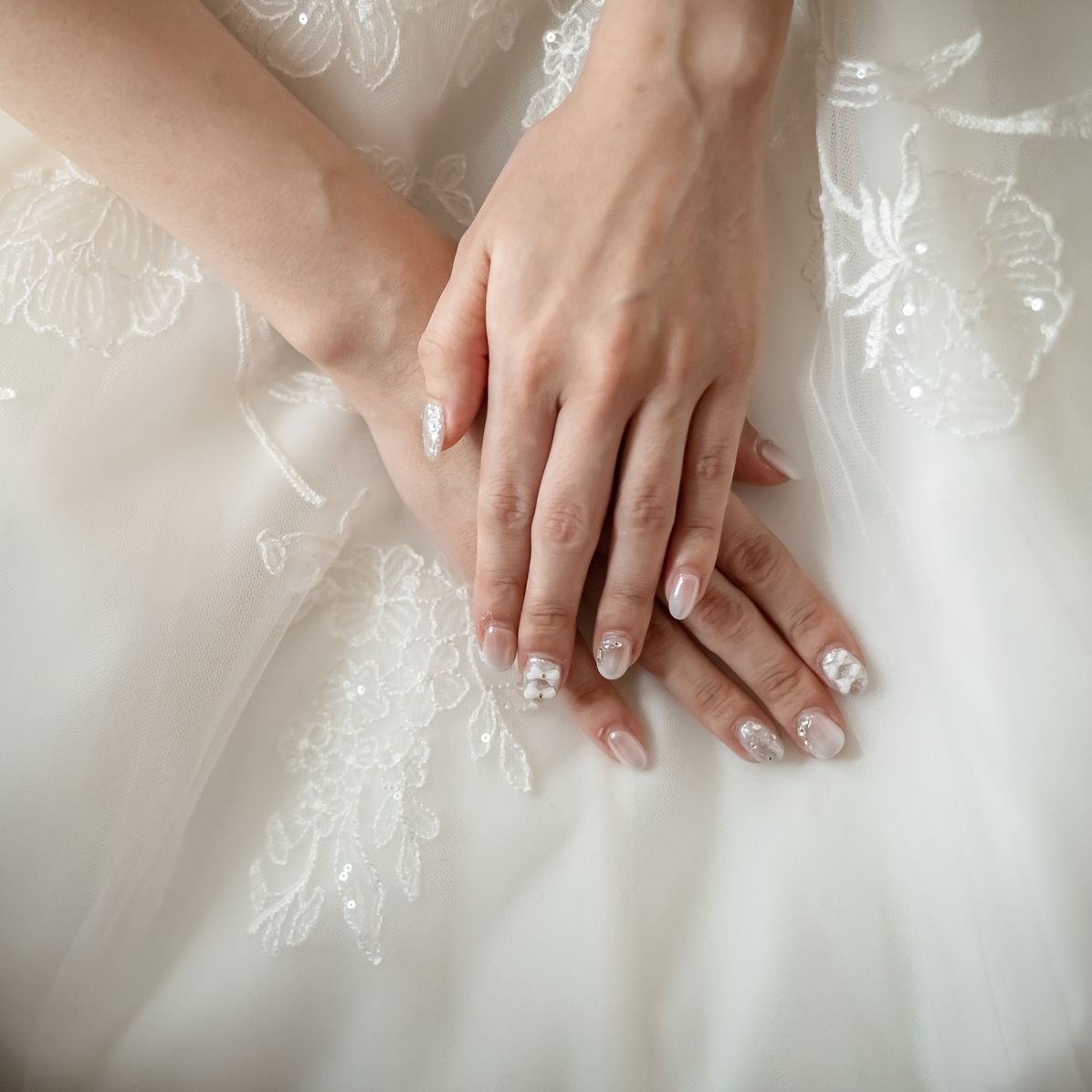 ネイルは挙式と披露宴どちらにも違和感なく馴染むように、ホワイト系でまとめた王道のウェディングネイルにしてもらいました。