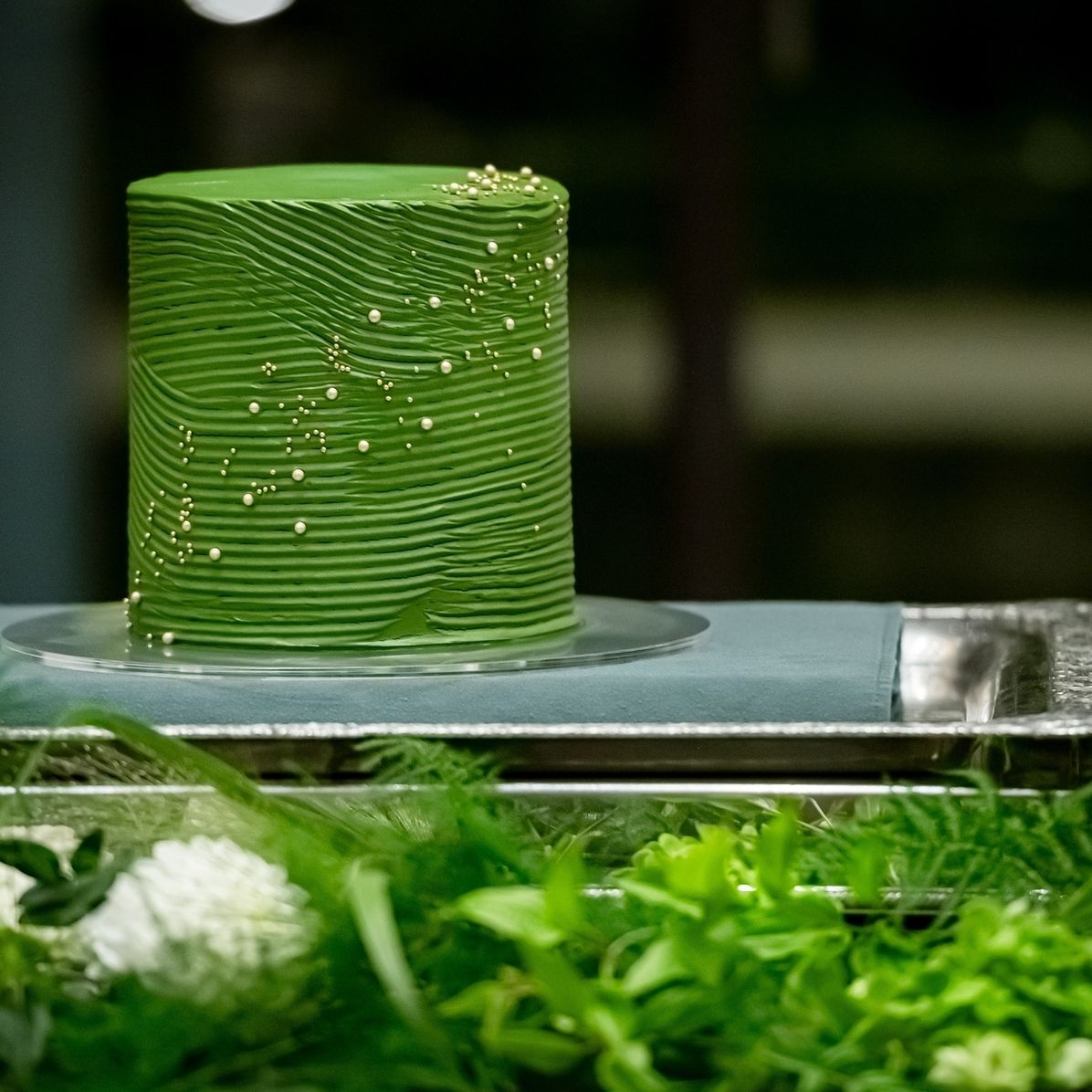 ウェディングケーキは、式のテーマに合わせてグリーンを基調にしたデザインにしました。