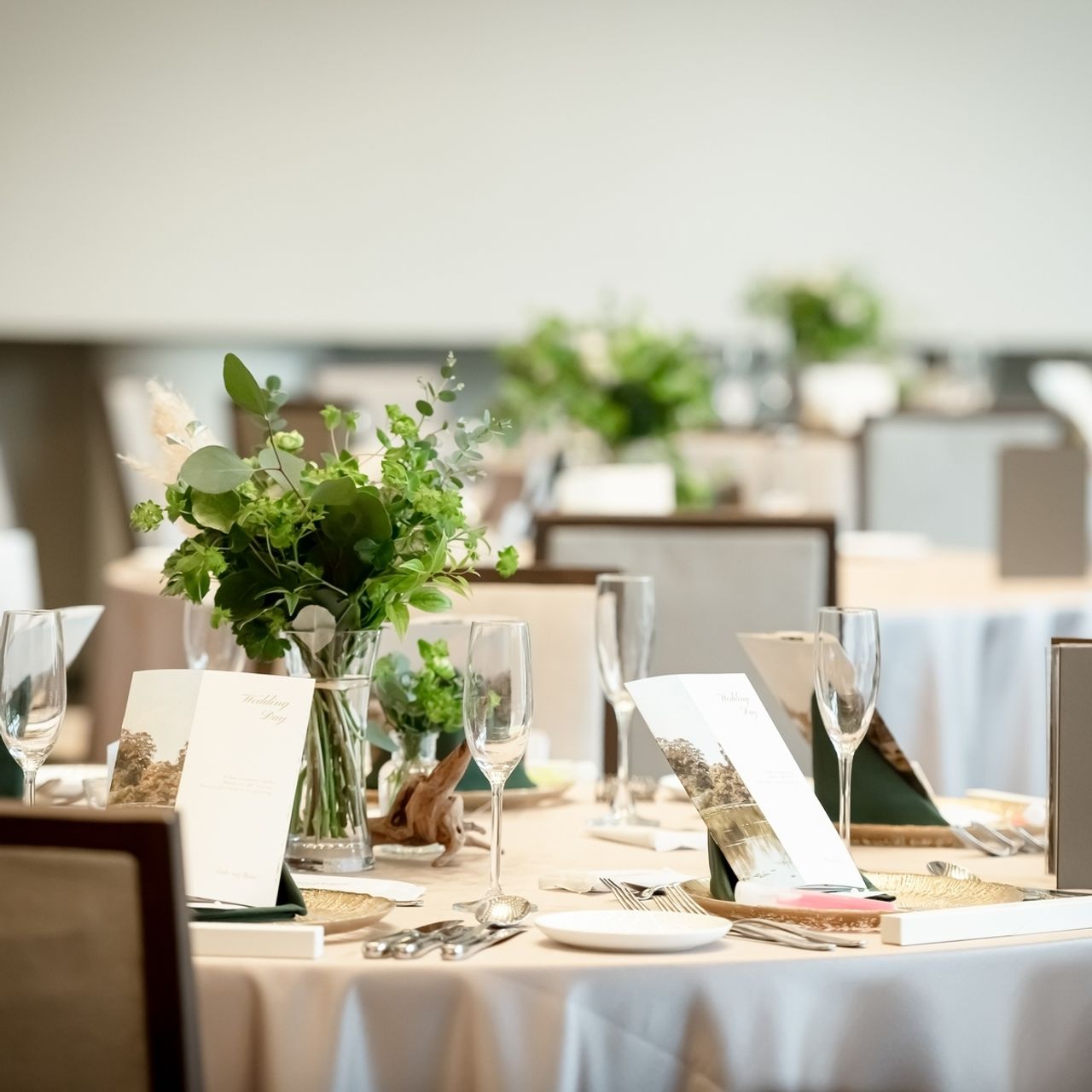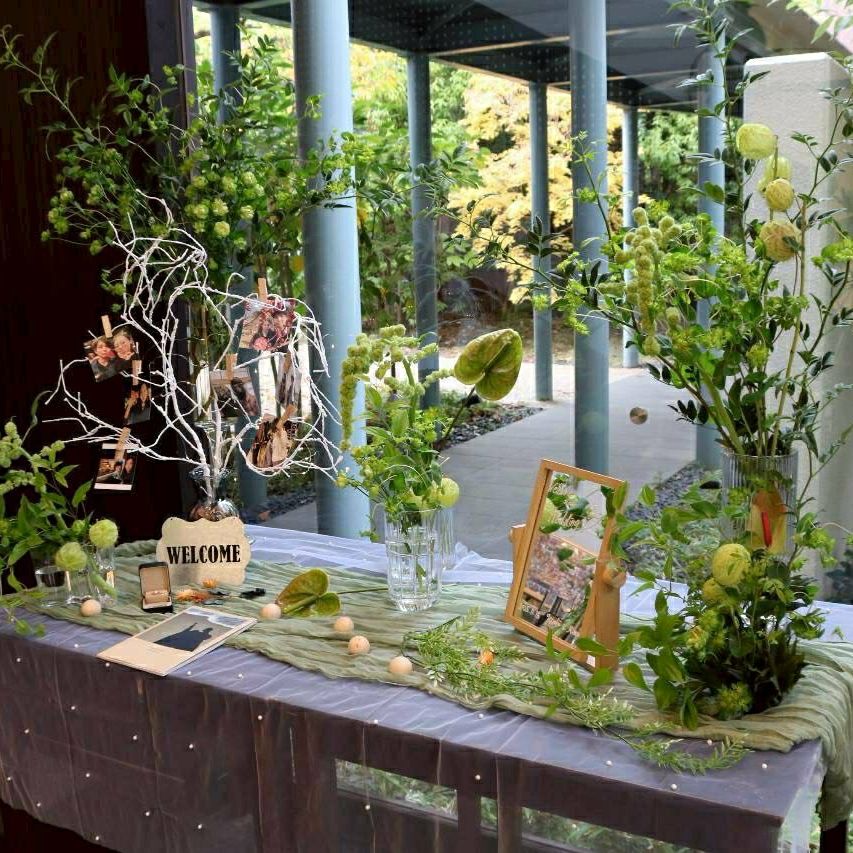 装花は結婚式のテーマに合わせて、私たちが大好きな「グリーン」を主役にお願いしました。お花をたくさん使うというよりも、草花や葉物を中心にしたナチュラルなグリーン多めのテイストにしてもらい、会場全体が自然に包まれるような雰囲気を意識しています。