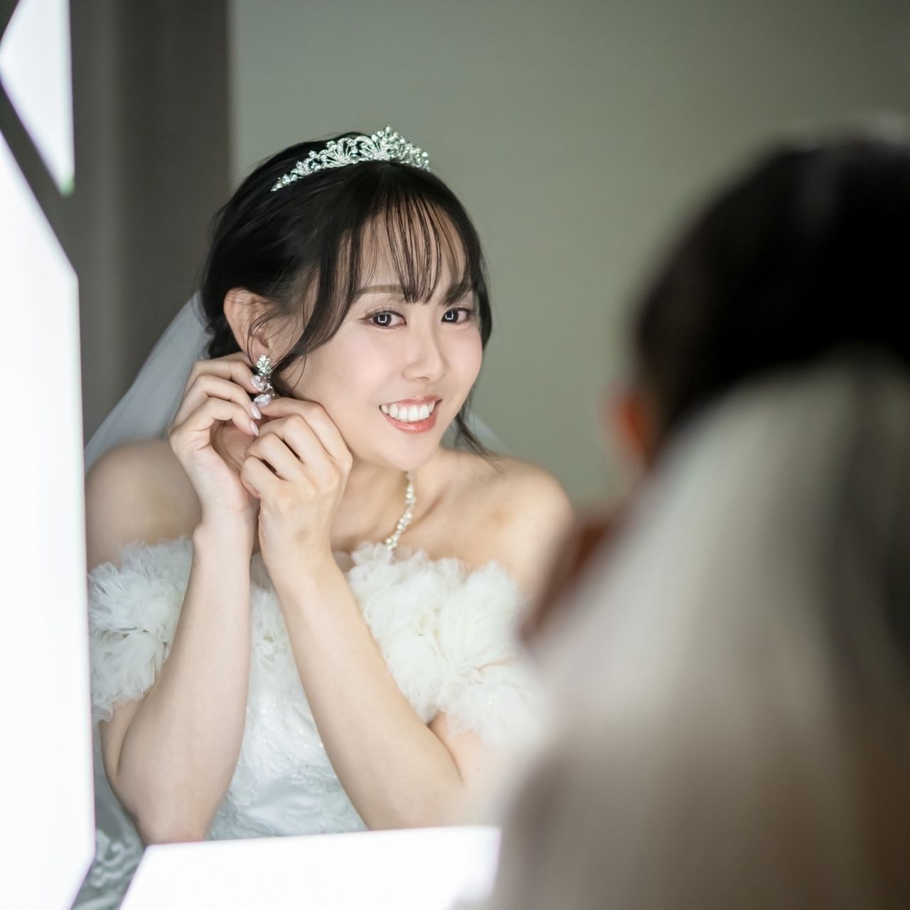 挙式ではアクセサリー全体の統一感を大切にしたかったので、シルバー系で揃えたセットのヘッドアクセサリーを選び、王道のティアラスタイルにしました。ドレスやネックレスとのバランスも取りやすく、花嫁らしい華やかさと上品さがしっかり出るところがお気に入りです。