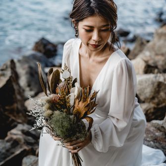 等身大の私たちでいられることをコンセプトに。背伸びはせず、シンプルでかつどこかカジュアルさを残しつつもゲストにはしっかりおもてなしを。バンケットに合わせて色味は白・ダスティーブルー・シルバーを基調に、スタイリッシュな雰囲気にしました。