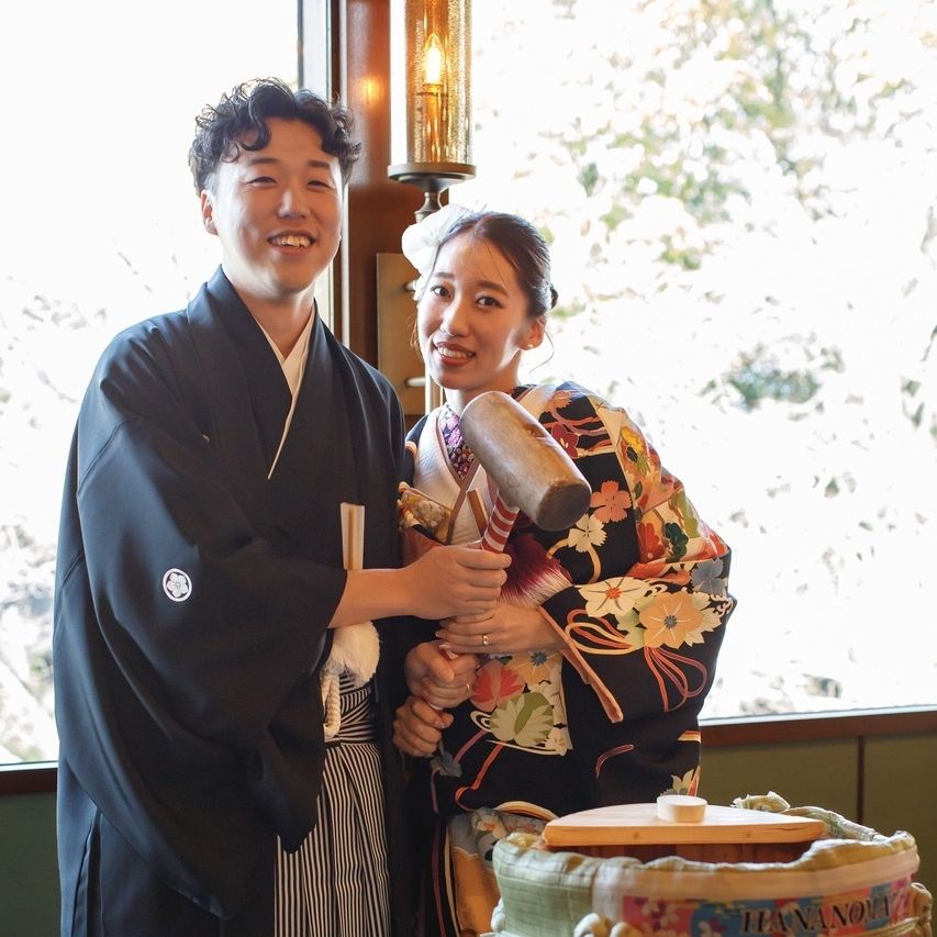 主人とのウェディングケーキのファーストバイトは、恥ずかしく似合わないだろうと思ったので、鏡開きを行いました。和装での初鏡開き、良い経験になりました。