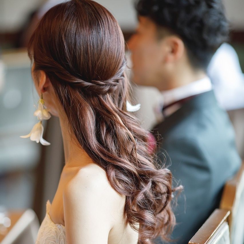 挙式はドレスに注目していただきたく、シンプル目に。披露宴入場は少しカジュアルダウンをしたく、ねじりハーフアップで巻き髪にしています。