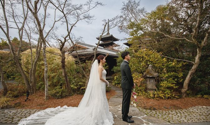 式場選びでは洋も和も譲れず、京都の日本らしさを大切にされていて、会場に入るとクラシカルな雰囲気もあり、両方の良いところ取りができるザ・ソウドウ東山京都(THE SODOH HIGASHIYAMA KYOTO)さん一択でした。また、京都出身の彼と私の祖父母のお墓がある東山での挙式を希望し、会場から東山ならではの八坂の塔が見えるのもマストな条件でした。