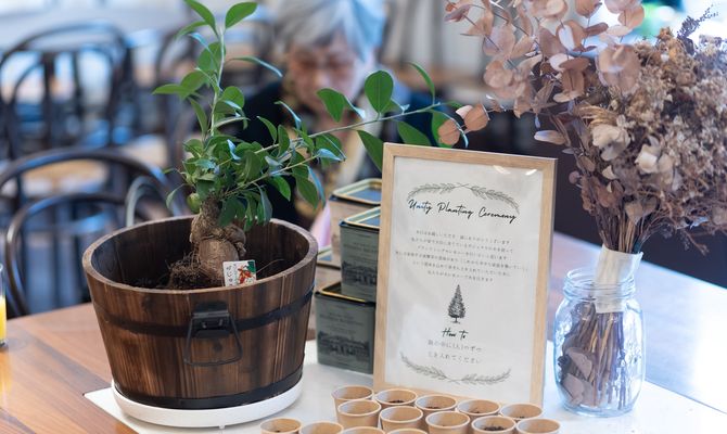 ゲストの方と一緒に楽しめるような結婚式にするため、余興をなくし、フリータイムをたくさん取り入れることでゲストと話す時間をたくさん取ることができました。また、プロフィール紹介は受付でゲストに書いていただいた質問力ードを引き、その質問に私たちが答えていく形式にするなど、温かい雰囲気で式が進行していけるように工夫しました。