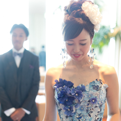 ベネチアングラスをイメージした刺繍がとっても素敵なブルーのドレス。試着した時のラインの美しさに惚れ込みました。ピンクのドレスの甘さから、一気に凛と輝く雰囲気を演出したいと思い選びました。大ぶりのイヤリングも存在感たっぷりでした。