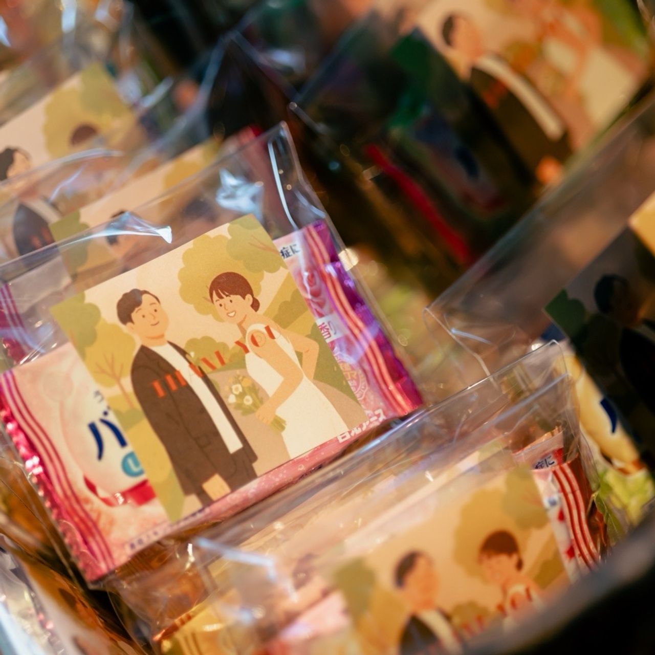 食料品の持ち込みがNGだったため、入浴剤を包装して持ち込みました。前撮りの写真をもとにAIにデザインを考えてもらい、文字入れや形は自分で編集して印刷しました。柔らかい雰囲気のギフトになってよかったです!