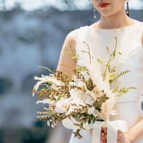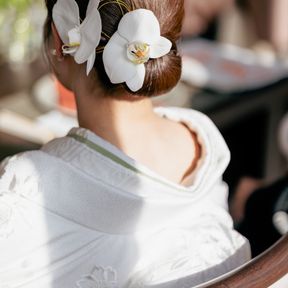 和装とドレスの両方を着用したので、和装ではスッキリとまとめ、ドレスはアップにしてリボンを付けカジュアルめにしていただきました。和装では胡蝶蘭と水引きのシンプルな組み合わせをお願いし、ドレスは新郎のタキシードがブラウンだったのでそれに合わせてブラウンのリボンを付けました。