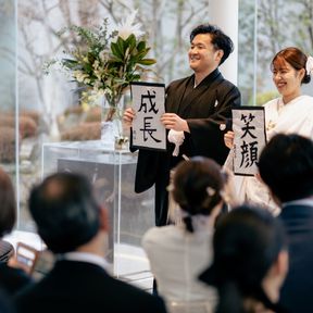 とにかく「ゲストに感謝を伝え、楽しんでもらうこと!」をテーマに余興は行わず歓談やフォトタイムを多めに確保しました。また挙式ではプランナーさんご提案の書き初めによる誓いの言葉や目隠しファーストバイトなどゲストも参加して笑ってくれることを夫婦で協力して行いました。
