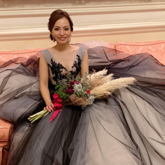 ブラックだけど、内側がピンクベージュをくすみブルーベージュのチュールが何層にも重なっており、1番上の層だけブラックなので重すぎなくみんなにはグレーのドレス?とも言われるくらい黒過ぎないドレス。