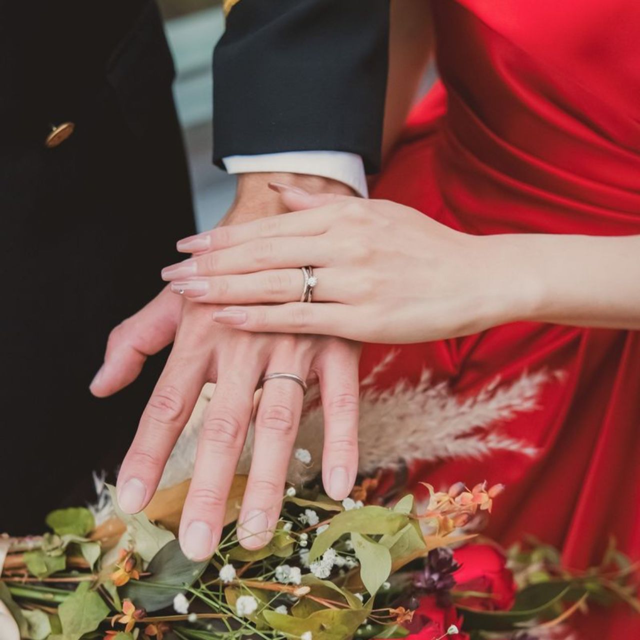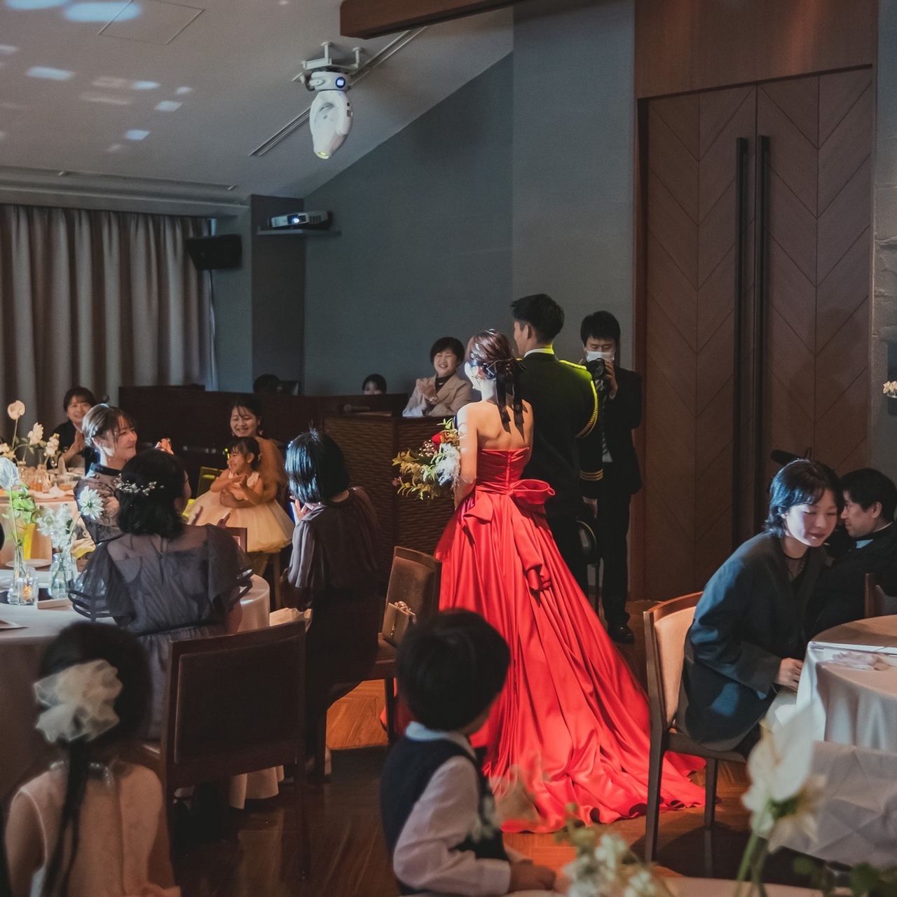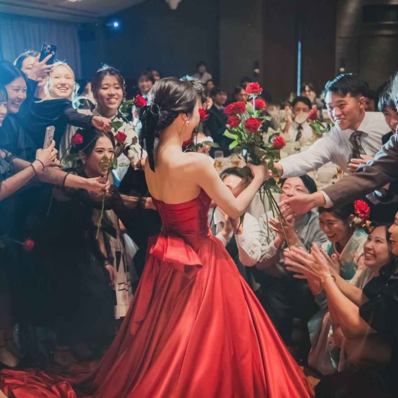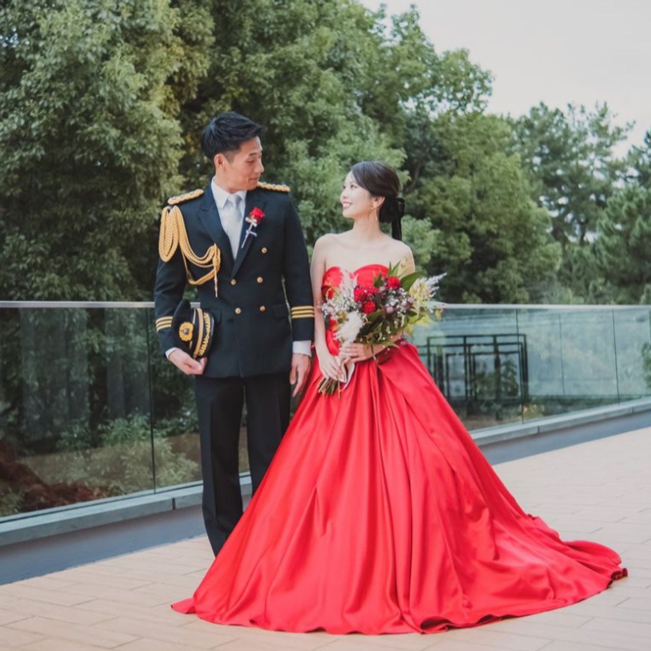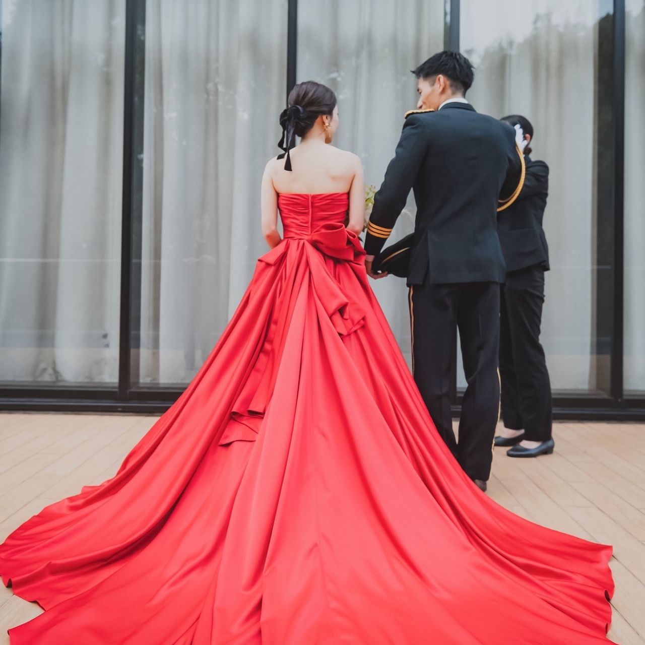 夫が儀礼服を着用する予定だったため、それに映えるカラーのドレスを探し、その中で主役としてしっかり存在感を放てる赤のドレスを選びました。