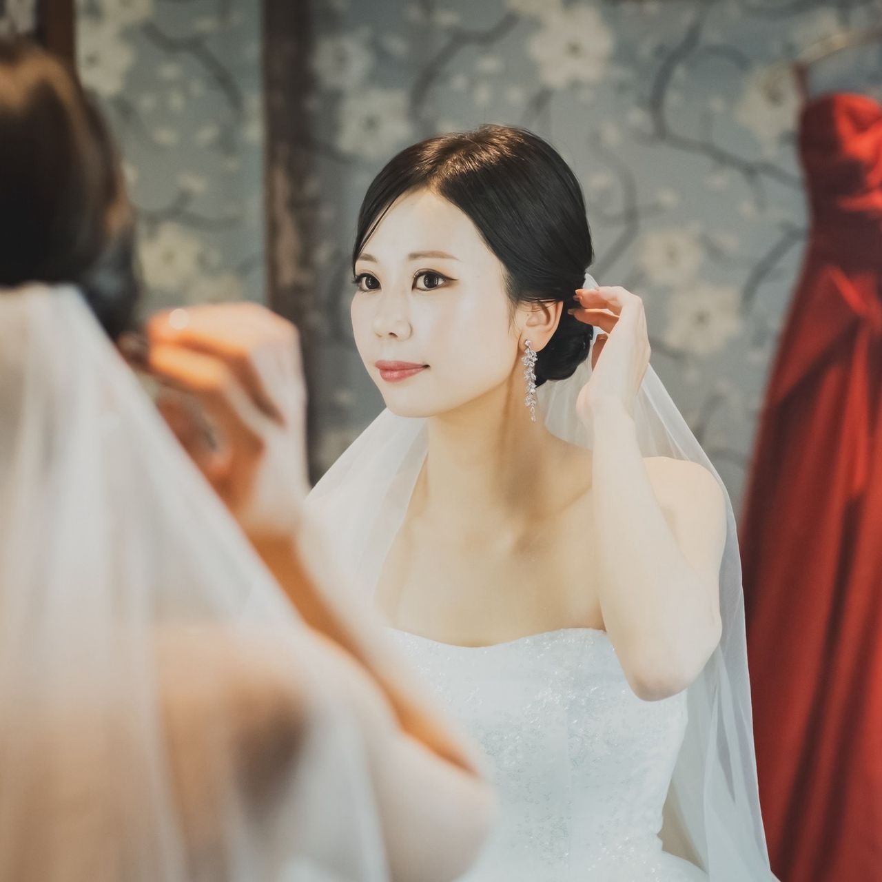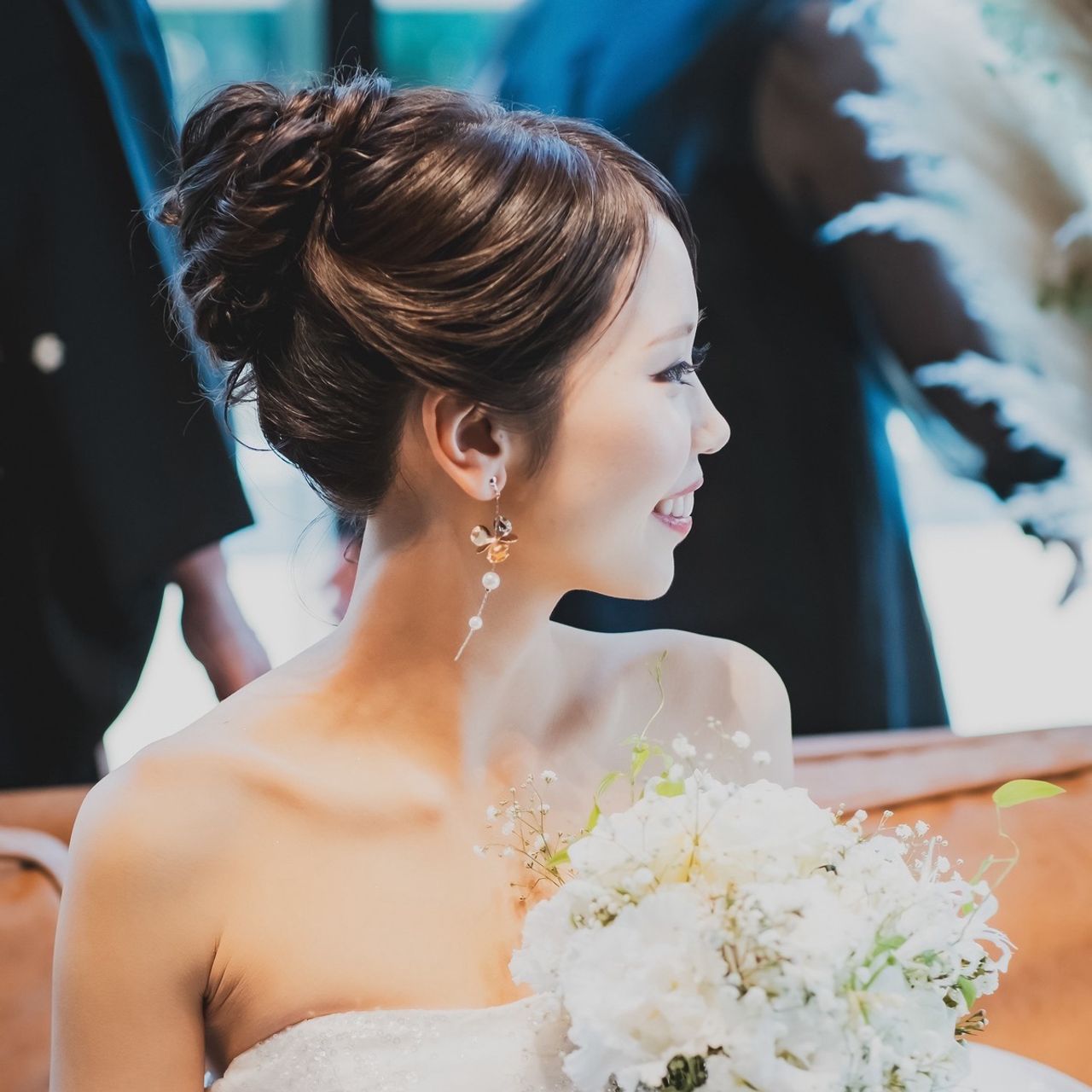 挙式では上品で大人っぽい雰囲気にまとめていただき、披露宴ではお団子ヘアで柔らかく可愛らしい印象になるよう仕上げてもらっています。
