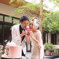 ケーキ入刀の代わりにイチゴミルクのカラードリップ、ファーストバイトの代わりにクッキーバイトを行いました。ケーキはマカロンやお花をあしらった可愛いデザインに一目惚れをし、お願いしました。
