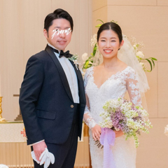 海外の新郎新婦に憧れがあり、総レースのWD、ロイヤルブルーのCDに、ショールカラーとカマーバンドを選びタキシードで装いはシックにしました。