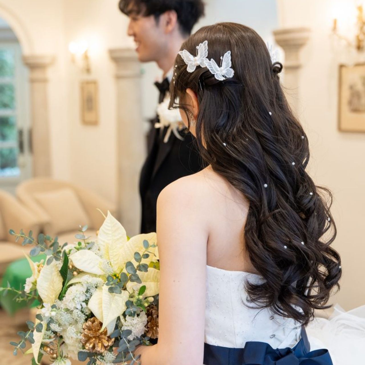 挙式はジルコニア素材のティアラを合わせ、披露宴入場時は蝶のヘアピンにパールシールをプラスし、可憐で遊び心のあるアレンジにしています。