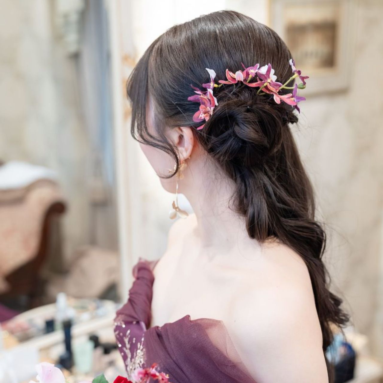 挙式は王道のシニヨンスタイルで、上品でクラシカルな雰囲気にまとめ、披露宴入場時ではハーフツインにアレンジし、華やかで可愛らしい印象にチェンジしています。さらに再入場では、くるみちゃんヘアのようなハーフアップ×シニヨンスタイルに仕上げ、少し個性をプラスしました。