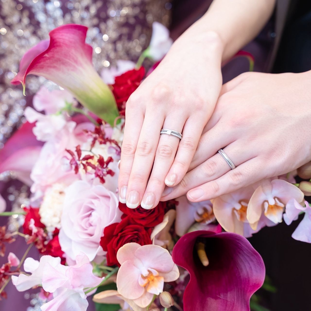 夫婦そろってTiffany & Co.のアクセサリーが好きだったこともあり、婚約指輪と重ねづけできるデザインを選びました。両側のエッジ部分にはミルグレイン加工が施されていて、シンプルでありながらもさりげない存在感があります。その繊細なデザインに一目惚れし「これだ」と感じました。