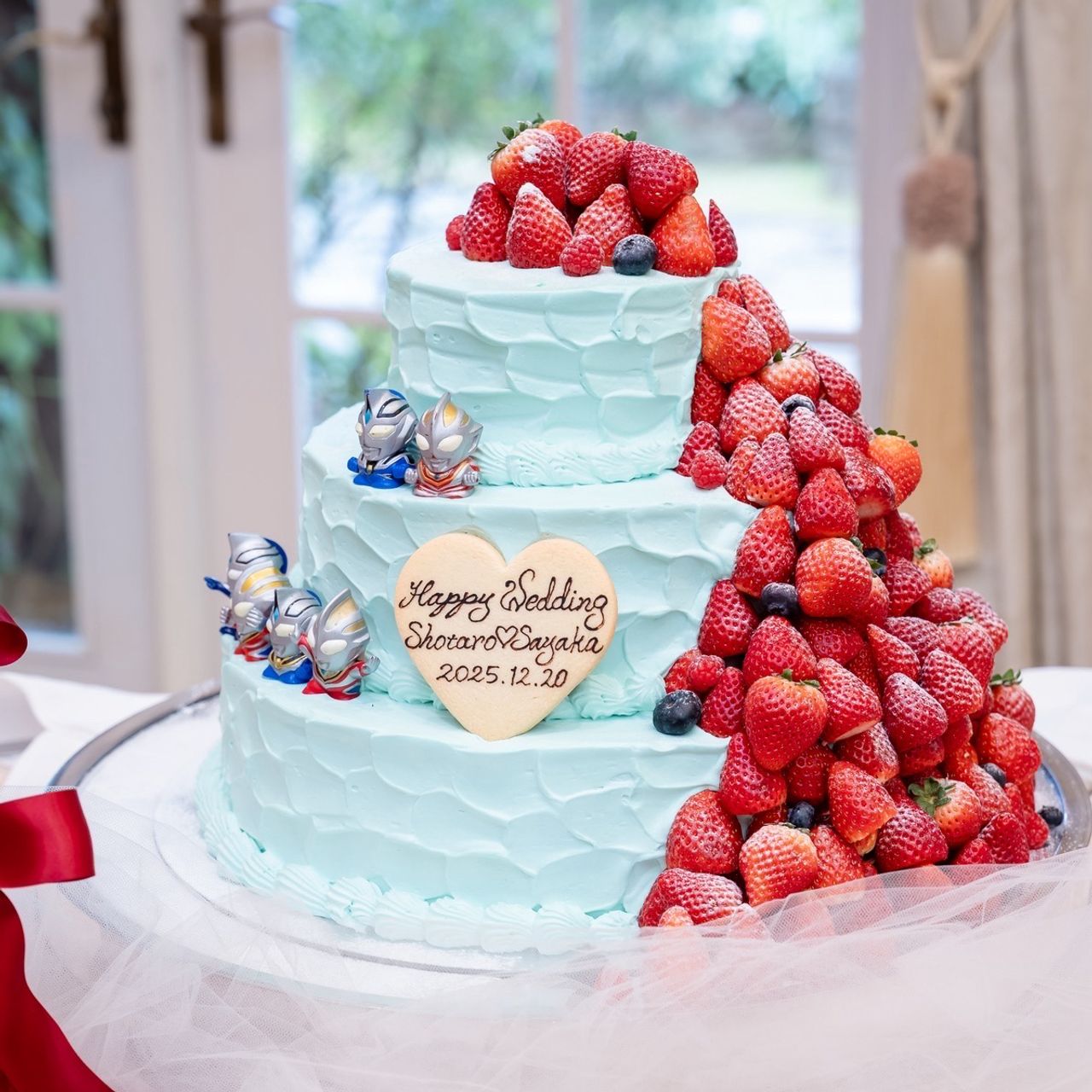 さらに、夫が好きなウルトラマンのミニチュアフィギュアを飾ったり、婚約指輪・結婚指輪ともに「Tiffany & Co.」のものを選んでいるため、ケーキのカラーもティファニーブルーを取り入れて、さりげなくリンクさせました。