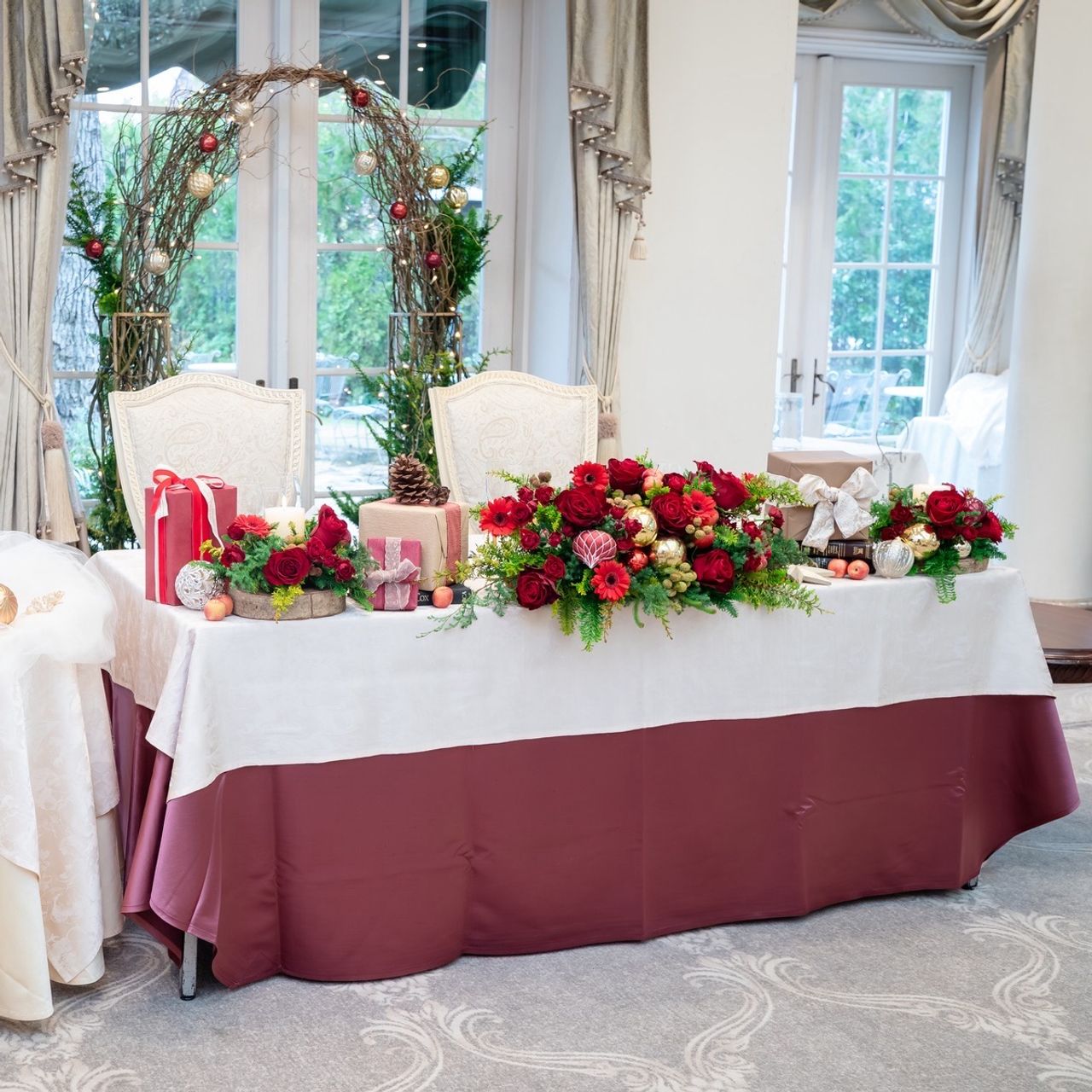 クリスマスがテーマだったため、ポインセチアや松かさ、薔薇に加え、オーナメントやプレゼントボックスも取り入れました。全体は赤で統一し、プレゼントボックスやキャンドルを配置することで、温かみのあるクリスマスらしい空間になるようにこだわっています。