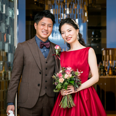 光沢のある大人っぽい深みレッドのドレスで、1着目とは印象をがらりと変えました。