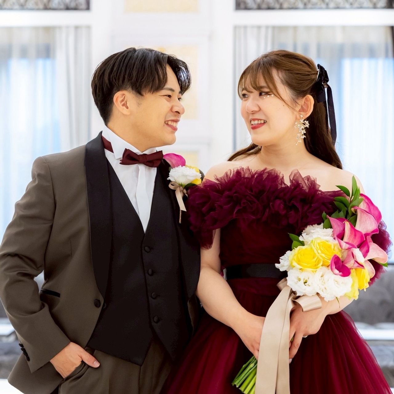 ウェディングドレスのときは白のラウンドブーケ、カラードレスのときは白基調にボルドーを混ぜたものにしました。