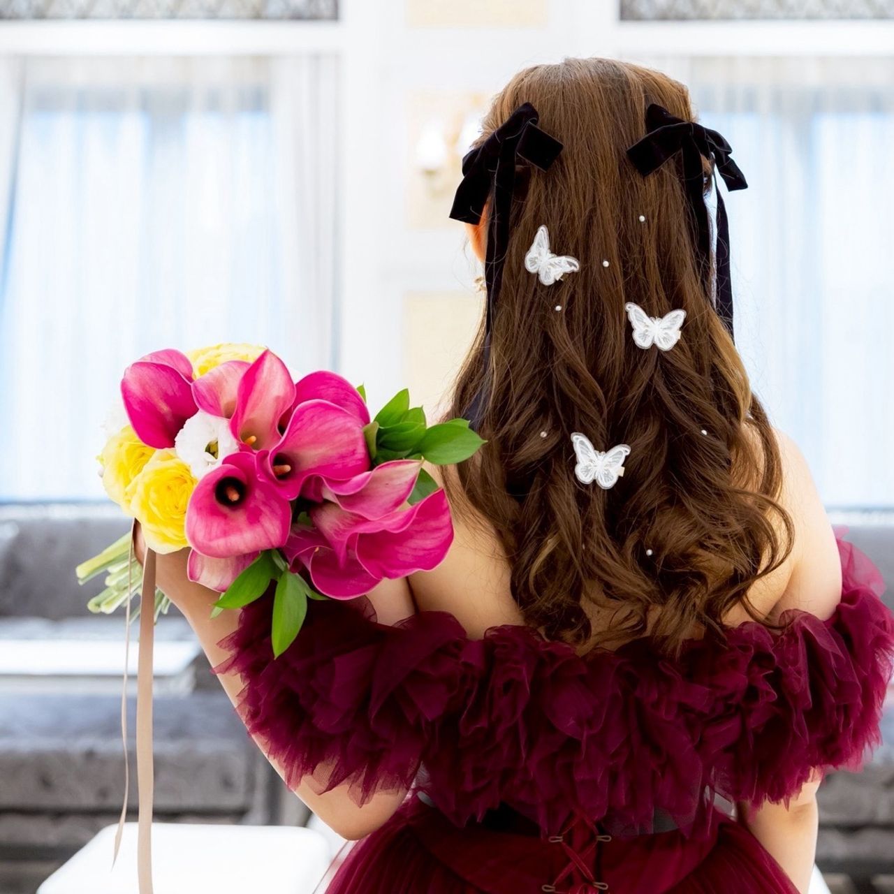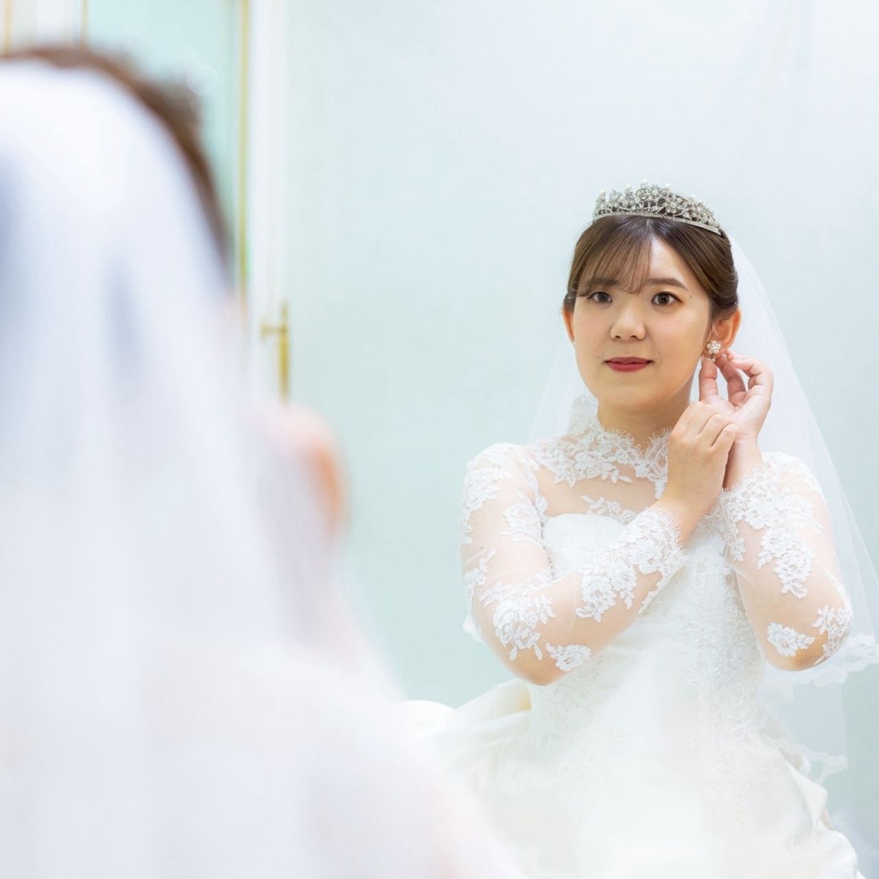 挙式と披露宴のウェディングドレスで、ヘアアクセサリーを変えたことがポイントです。