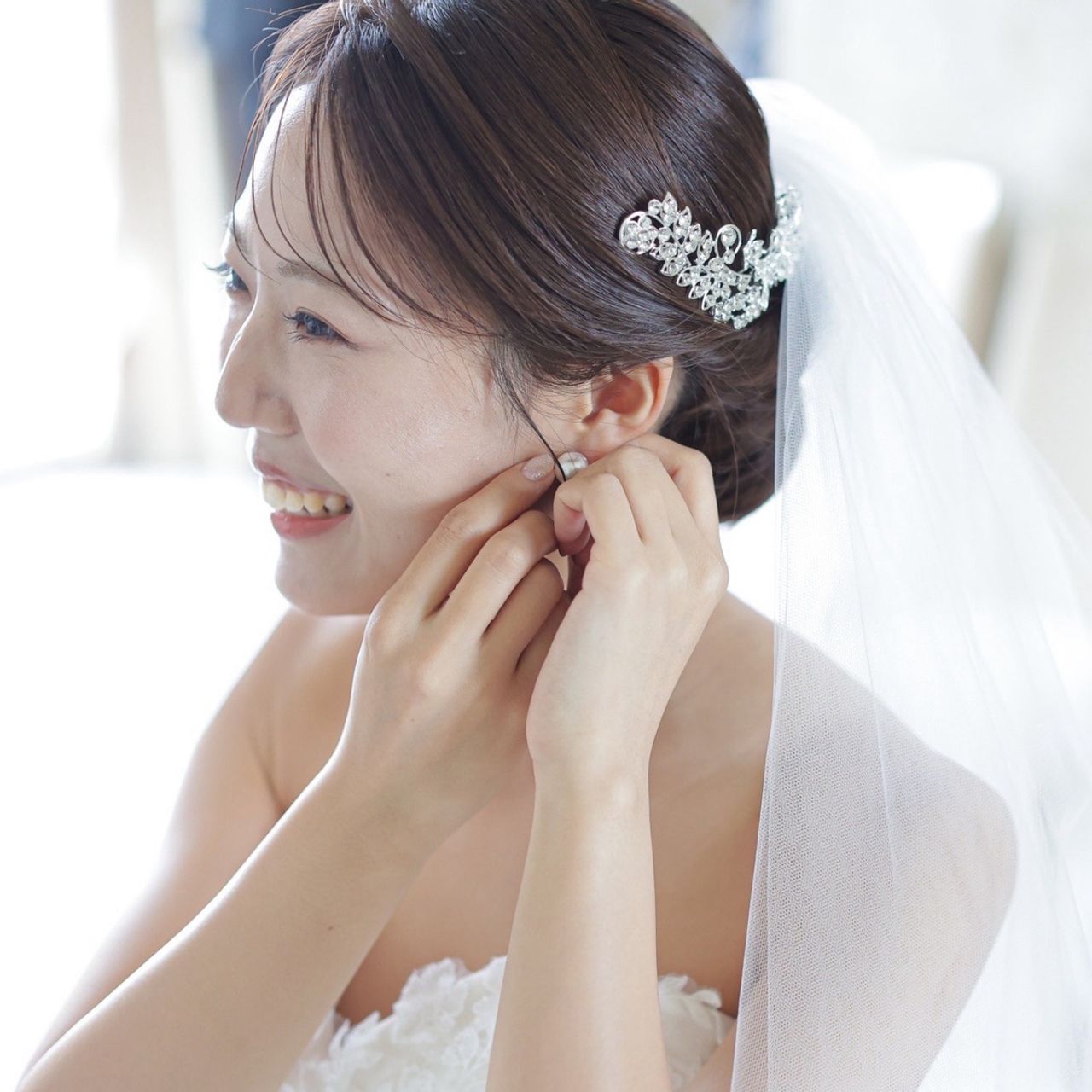 ヘアは変わり映えするように、挙式ではまとめて披露宴ではダウンスタイルにしました。披露宴では片側にパールをつけたところがお気に入りです。