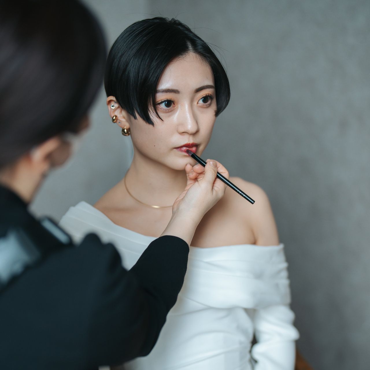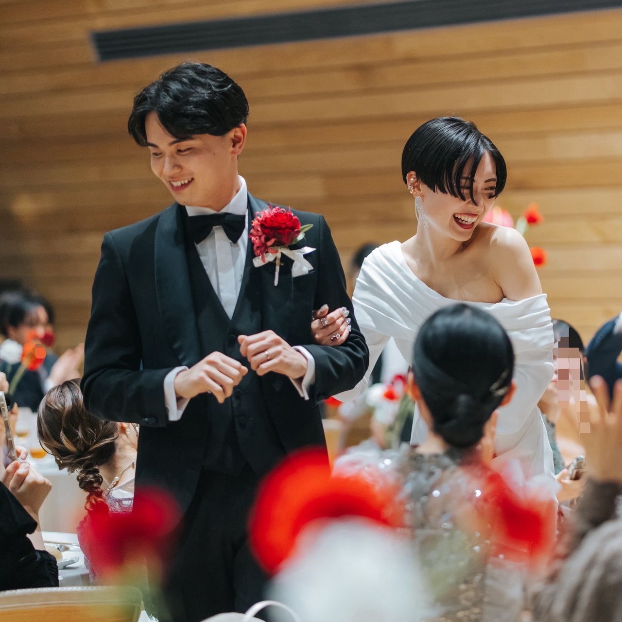 また、ヘアはショートヘアのため、1着目はテクノカットでシンプルに、お色直しではパーマ風に巻いてアレンジしてもらいました。ショートヘアはアレンジの幅が少ないと思いがちですが、ガラッと雰囲気を変えることができ、満足しています。