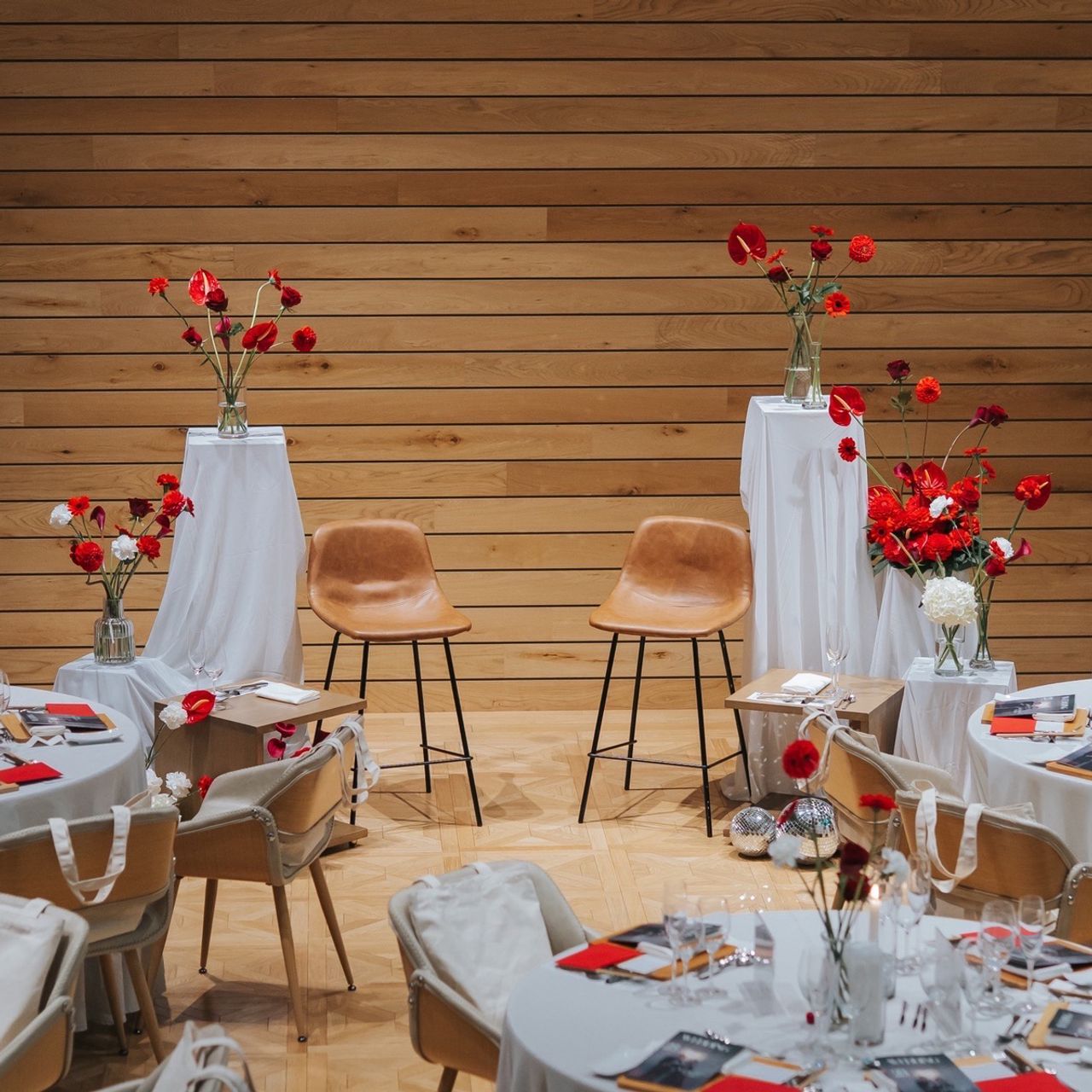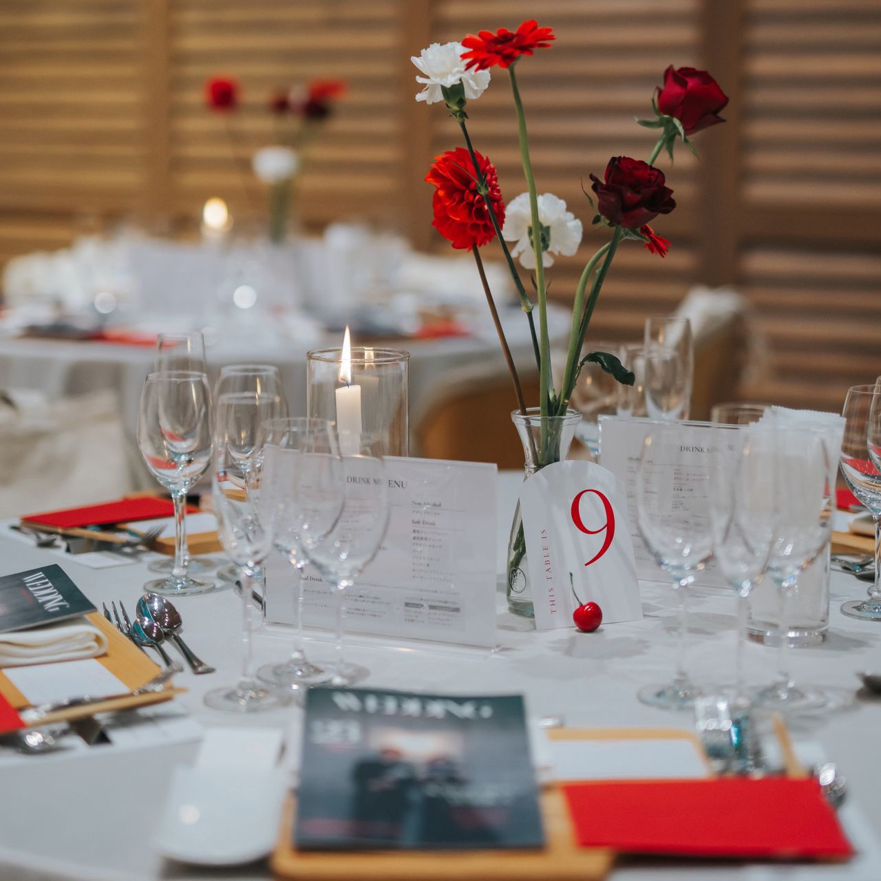 一つひとつのお花の美しさや個性を尊重してもらいたい、ボリュームでの華美ではなくシンプルだけど洗練されていてお洒落、色の統一感があり会場全体を見た時に赤の華やかさとスッキリした「間」のバランスが良いようになど、細かくお願いしています。