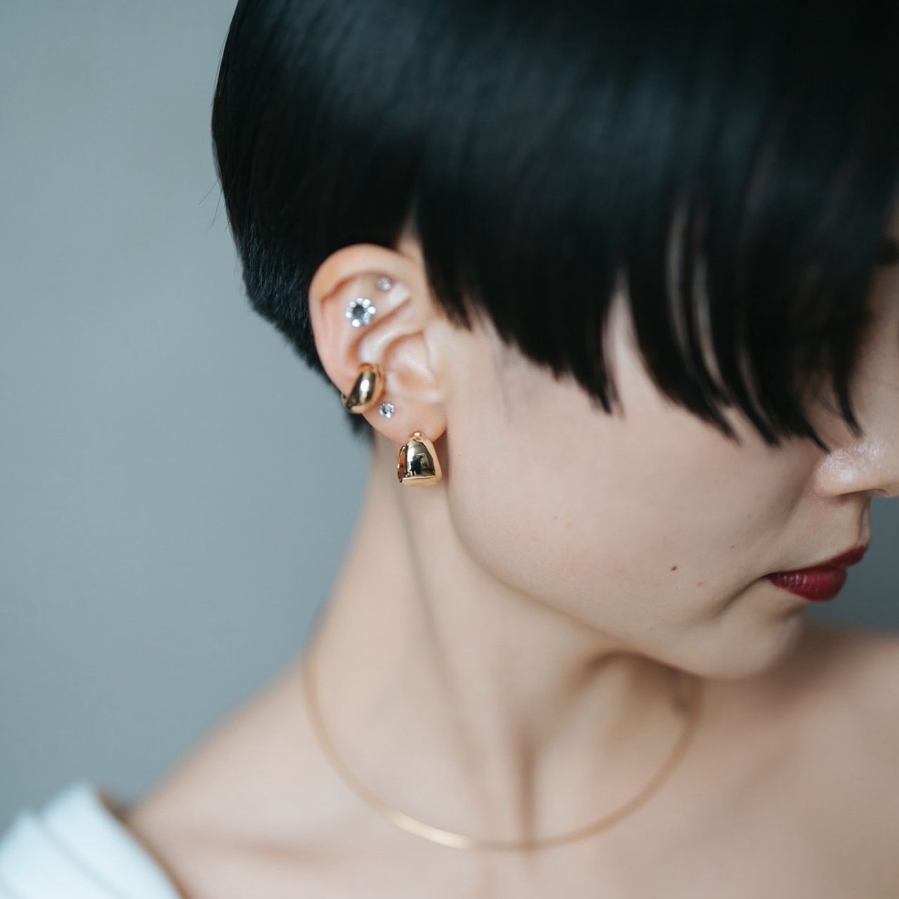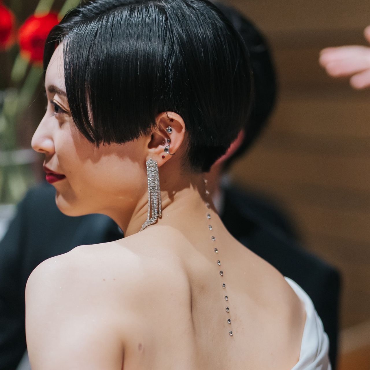 「挙式なので、上品に凛として見える範囲で、好きなお洒落を楽しむ」をテーマに、ゴールドをメインにしました。シンプルピアスとイヤカフ、細いシンプルチョーカー、耳つぼジュエリー数個、リングなどをつけています。