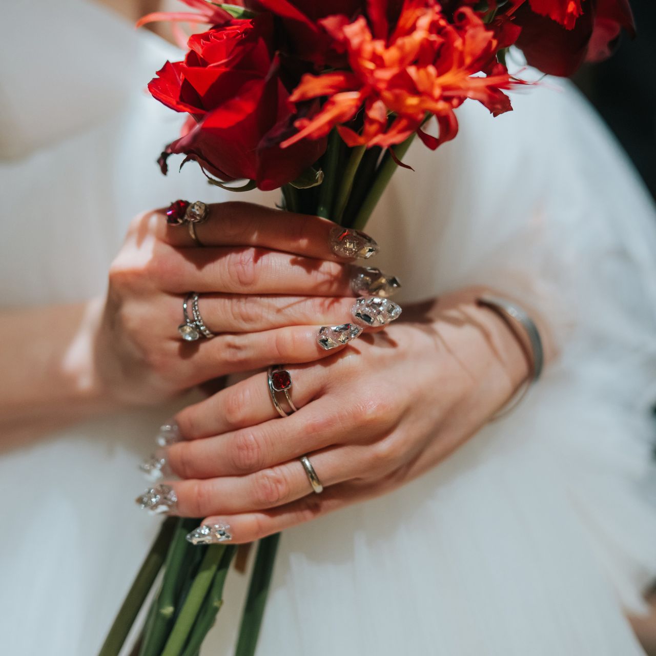 「披露宴はいくらでもキラキラさせて良し!手も耳も背中も目元もキラキラで盛りまくる」をテーマに、シルバーをメインにしています。キラキラピアスとイヤカフ、耳つぼジュエリー追加、リング複数、目元ジュエリーシール、背中ジュエリーシールなどで豪華に仕上げています。