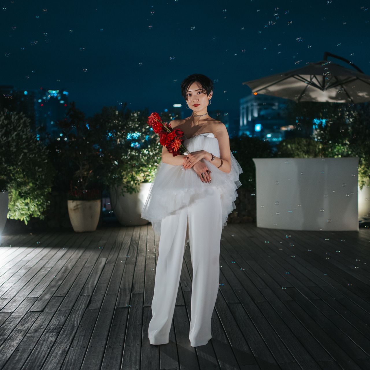 他にはない珍しいパンツスタイルで、少し太めのゆったりしたシルエットが魅力的です。そして何より、立体感のあるレースをふんだんに使ったビスチェが可愛すぎました!かっこよさと可愛さが詰まった、個性的で唯一無二、一度見たら忘れられない大大大好きなドレスです。