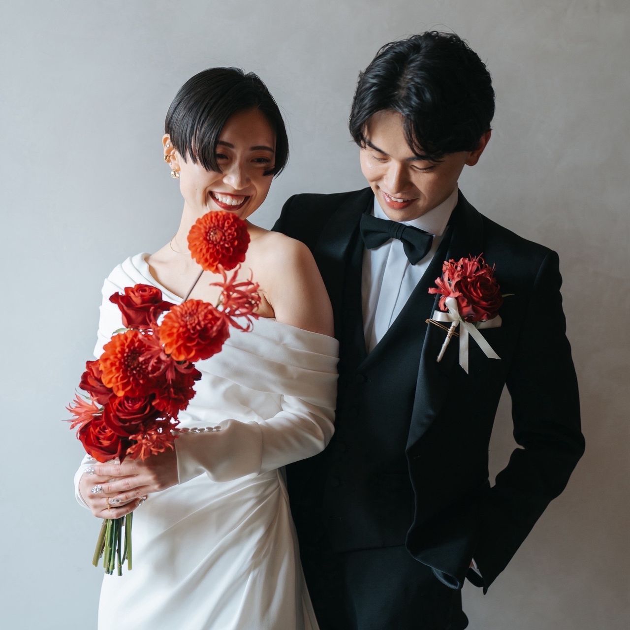 赤をメインに、ダリアやバラを多く使用してもらい、花の素材の魅力が伝わるよう、シンプルでスタイリッシュに仕上げてもらっています。束としてまとめるのではなく、少数精鋭でひとつひとつ目を惹きそれぞれが自立しているようなイメージでお願いしました。