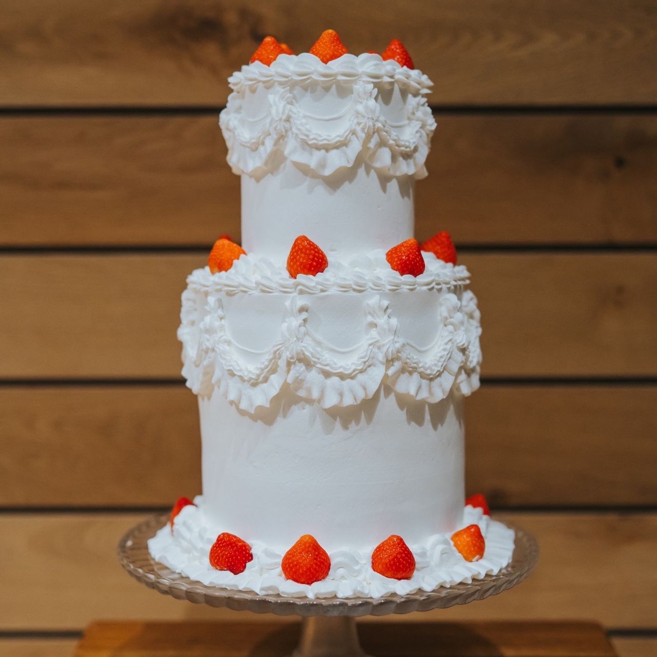 ウェディングケーキは、Pinterestでイメージを共有し、クリームとイチゴの2段ケーキにしました。シンプルなケーキだからこそ際立つ、真っ赤な苺と芸術的に絞られたクリームの美しさが印象的です。