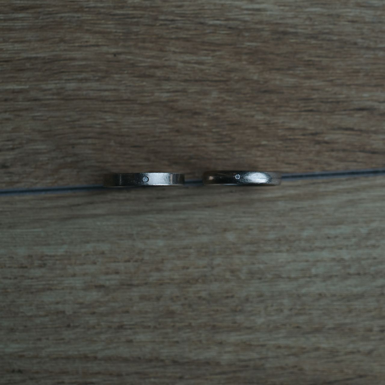 結婚指輪は、SHIHARAの少し太めでマット加工のリングです。普段からリングを複数重ね付けするのが好きなので、普段のファッションにも馴染むデザインを重視しました。控えめに埋め込まれたダイヤも、お気に入りポイントです。