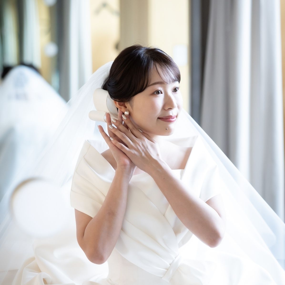 ヘアスタイルはやや高めのシニヨンで、ねじりを加えた崩しすぎず、かっちりしすぎないクラシカルな雰囲気にしています。