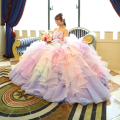 カラフルな色味が自分の性格や気持ちを表してくれているようでなんだかピッタリだなぁ!と 母や旦那さん、ゲストの皆さんにも珍しくて可愛い!すごく似合ってる!と言っていただけたので大好きなドレスです!