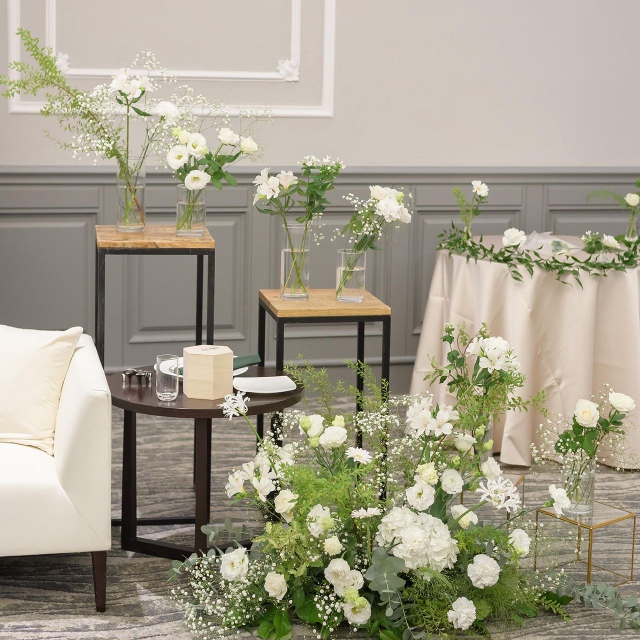 テーマカラーのホワイトとグリーンでまとめ、花々が自生しているような、足元にボリュームのあるデザインにしていただきました。