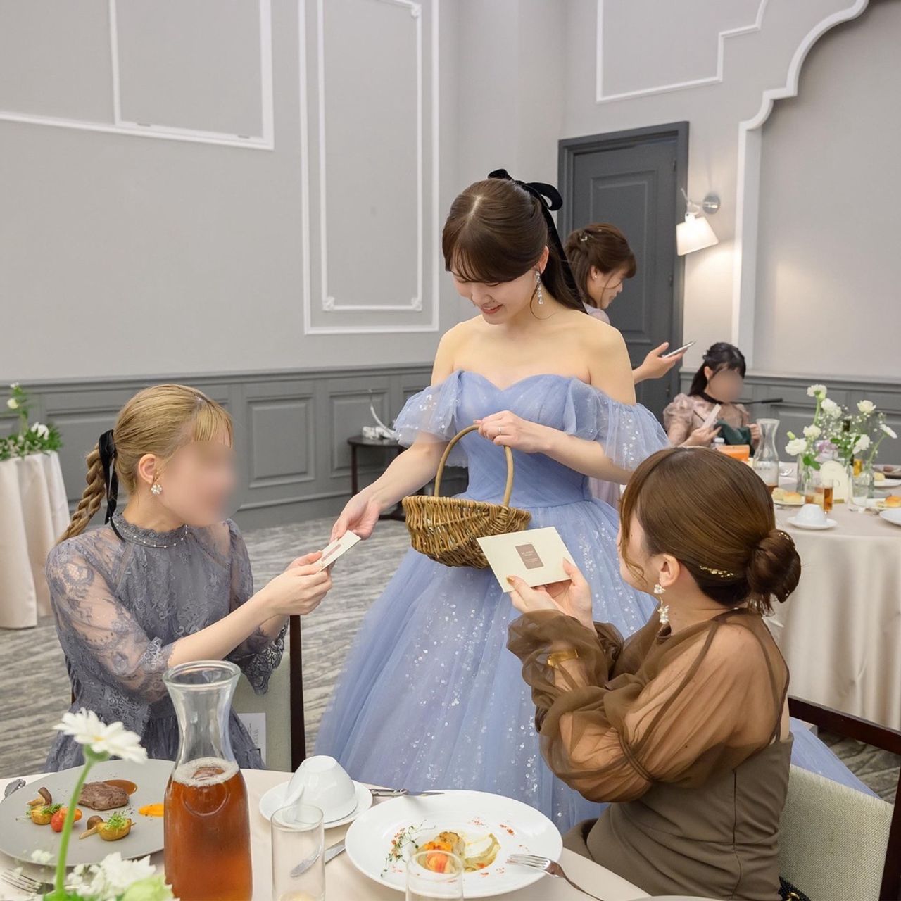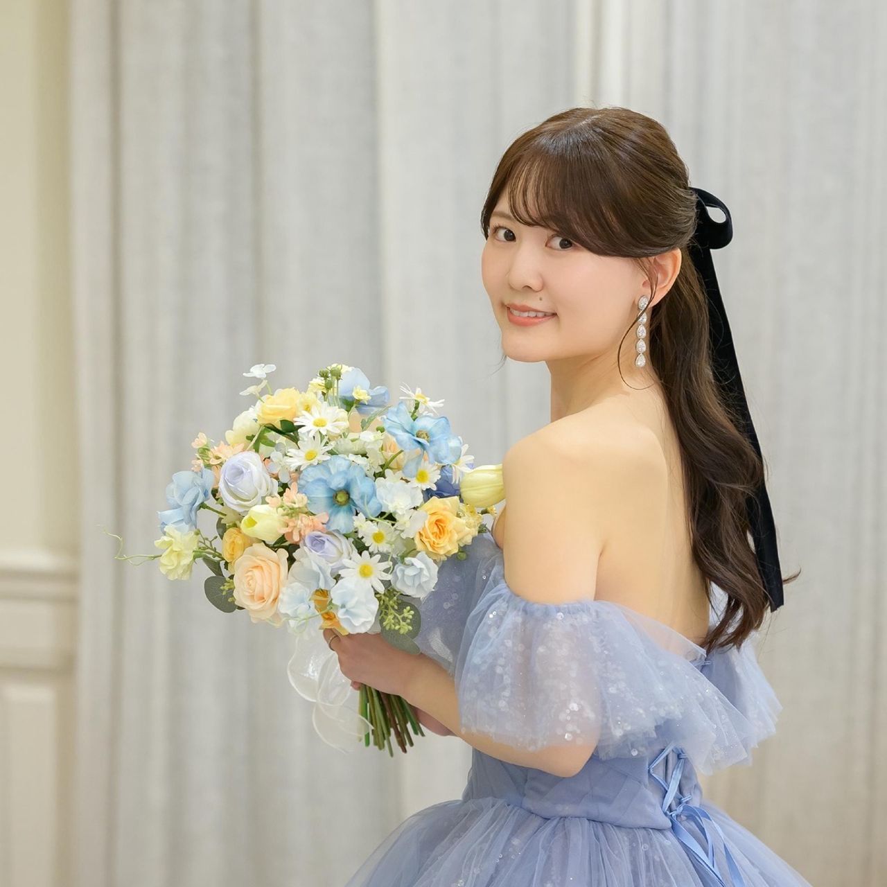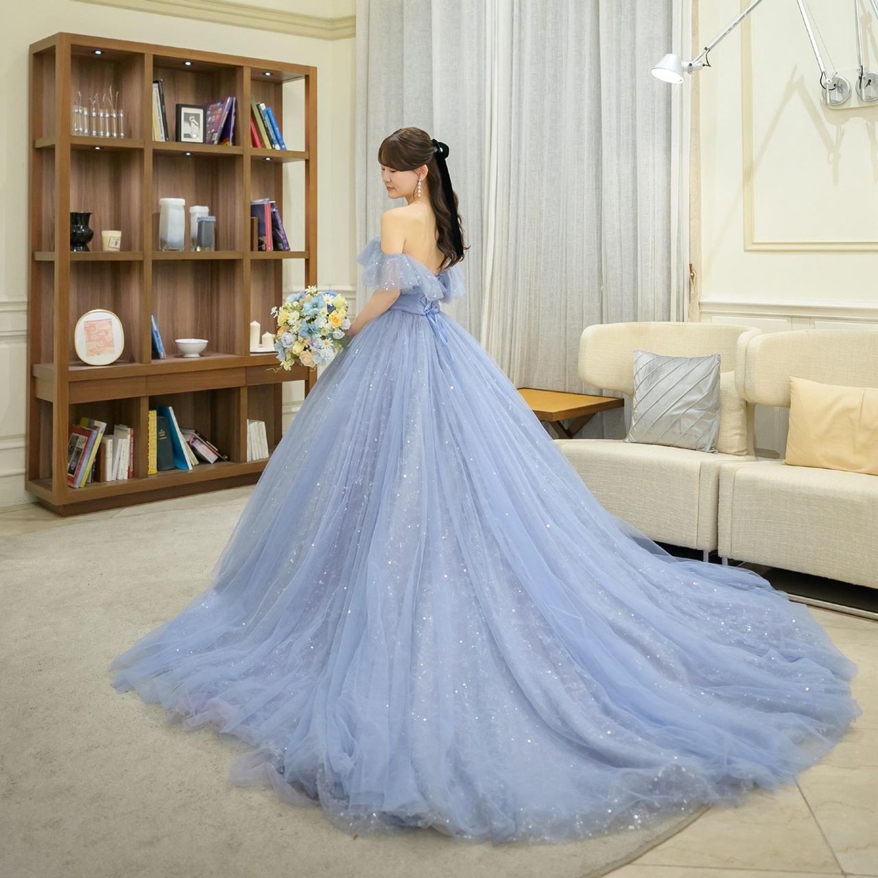 式場を決める前から気になっていたドレスです。何層にも重なったチュール生地にスパンコールがきらめき、ボリュームたっぷりのプリンセスラインがお気に入りです。ブルーの色味やオフショルダーの形も自分の好みにぴったりでした。