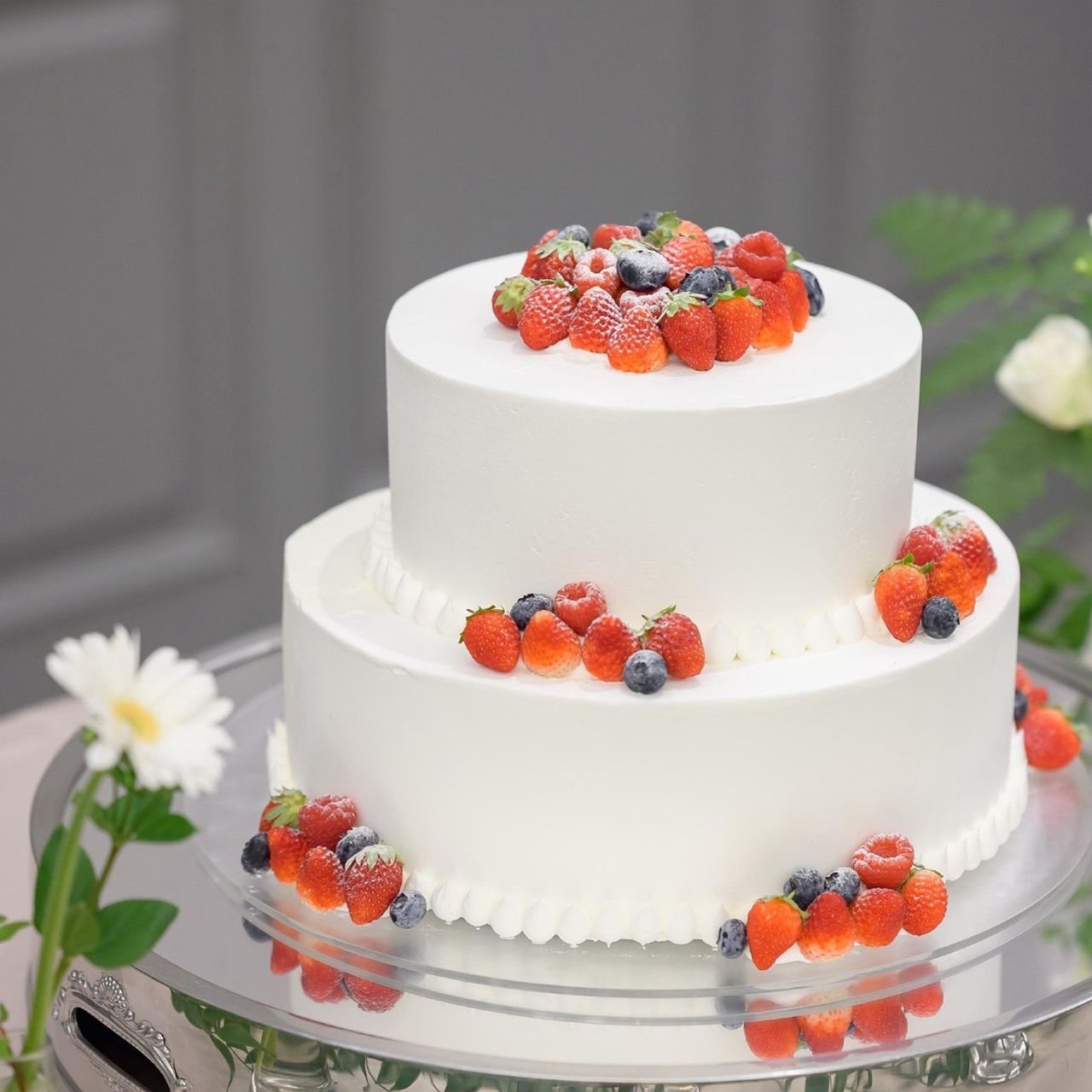 平らなナッペに細かいドットの絞り、定番のいちごやラズベリーが飾られたシンプルなケーキです。