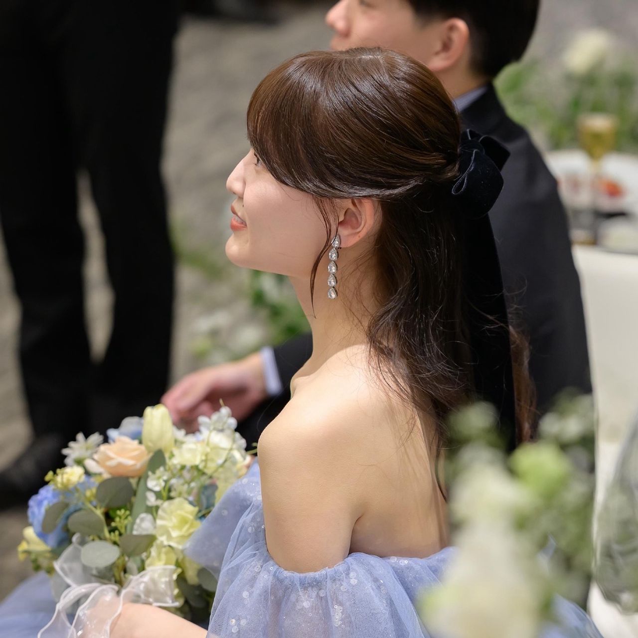 お色直しではイメージを変えたく、ハーフアップに。前髪から後ろの髪が繋がるようにサイドバングをセットしていただいたところがポイントです。