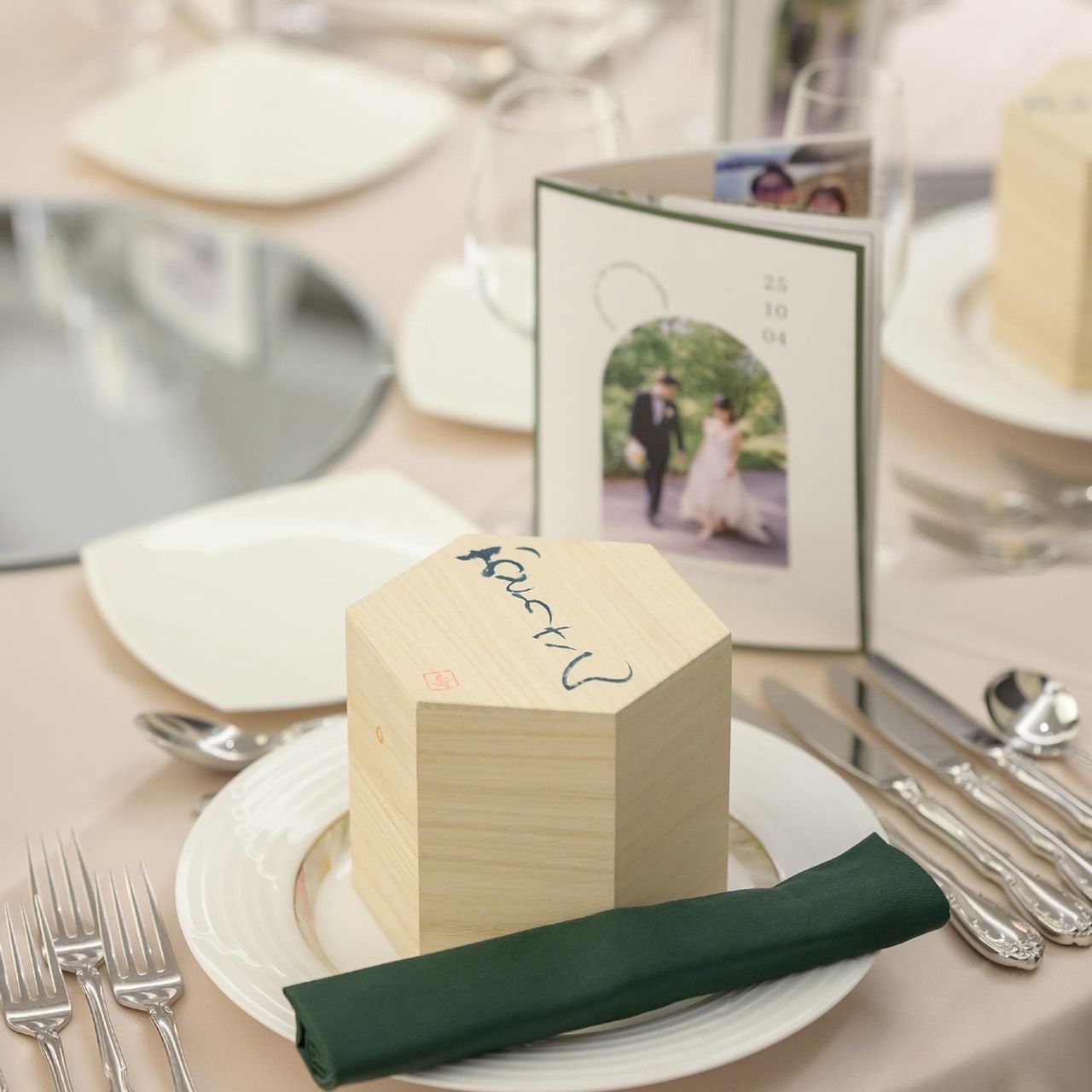 カップの木箱には名入れをしてもらえるので、席札としても活用できます。普段から呼び慣れているあだ名にすると会場が一気にアットホームな空間になっておすすめです◎