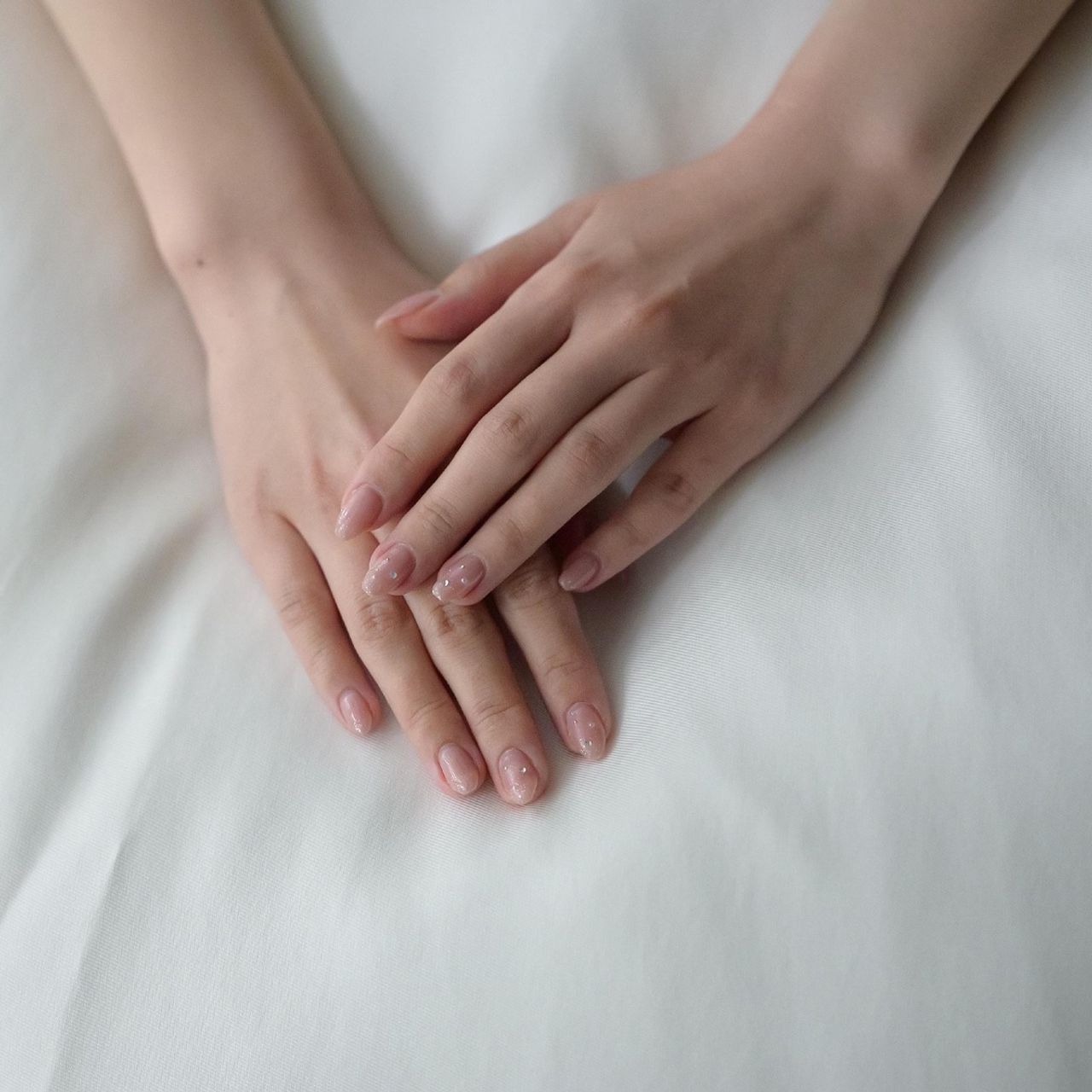 肌なじみのいいピンクベースに小さなストーンとパールを少しだけ付けて、目立ちすぎない上品な手元を意識しました。