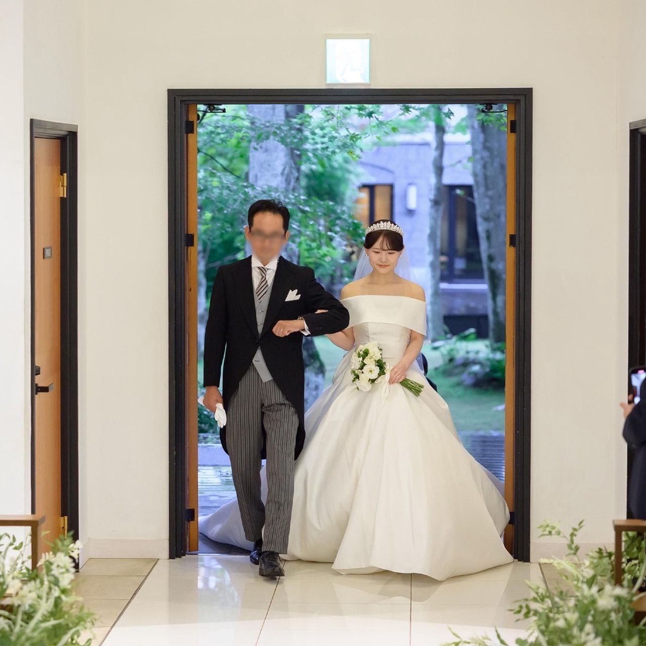 チュール系のドレスと比べると重さはありますが、ツヤっとした生地がホテル婚らしさを引き立ててくれたと思っています。また、ロールカラーの上品さや王道でシンプルなデザインが両親からも好評で嬉しかったです。